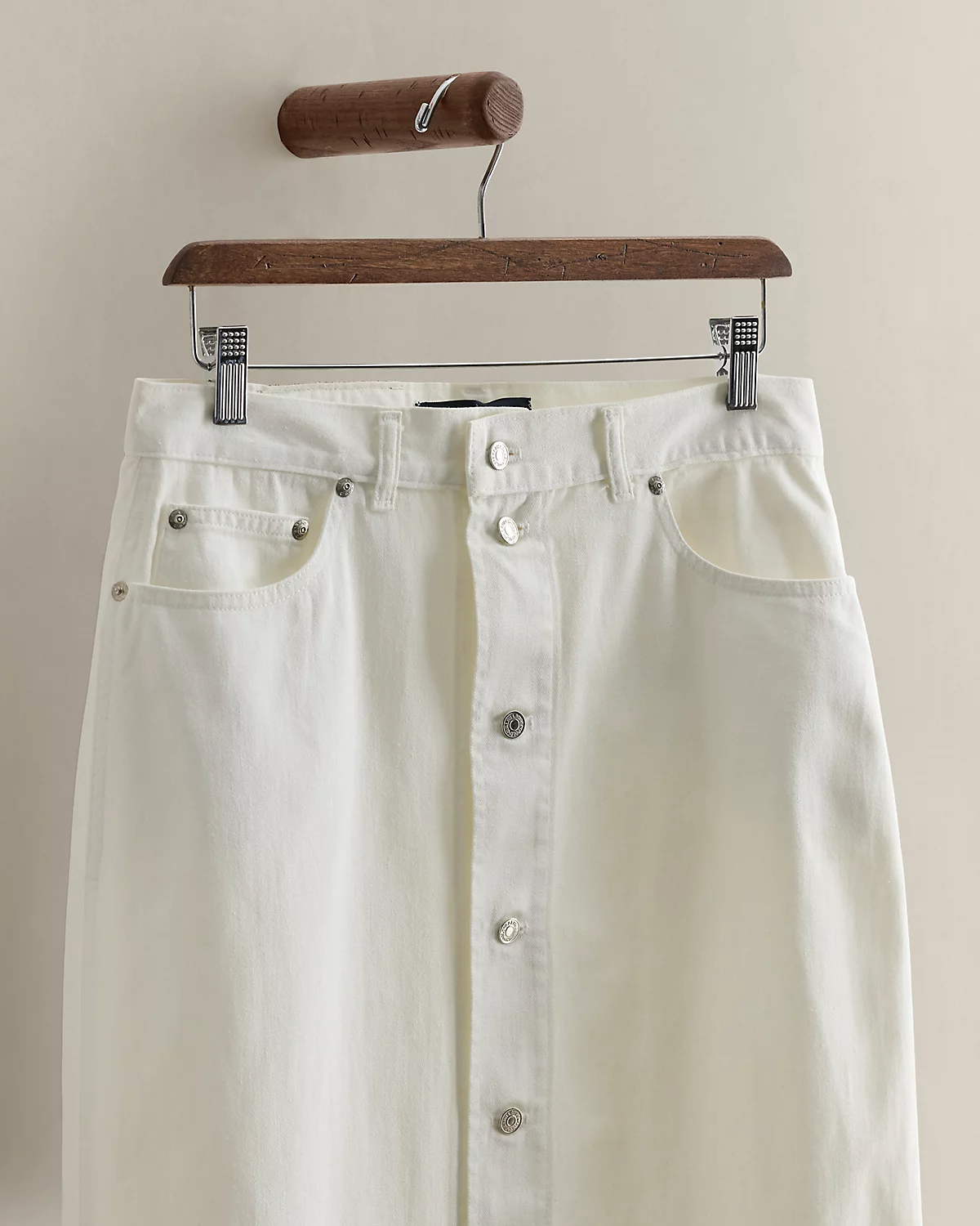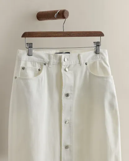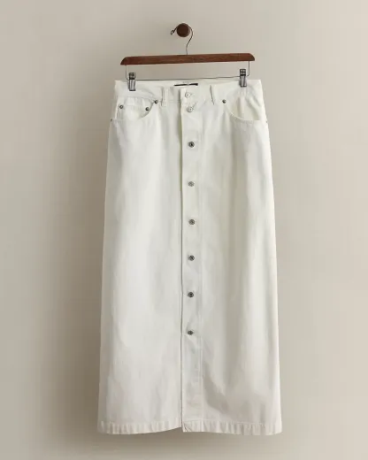 Circa 1985. Part of the women’s Ralpthth Lauren Collection. Made in America. Cotton denim midi skirt with a dived placket. Estimated size 8 has a 35.25" back body length, a 14.5" waist, and an 18.75" hip.