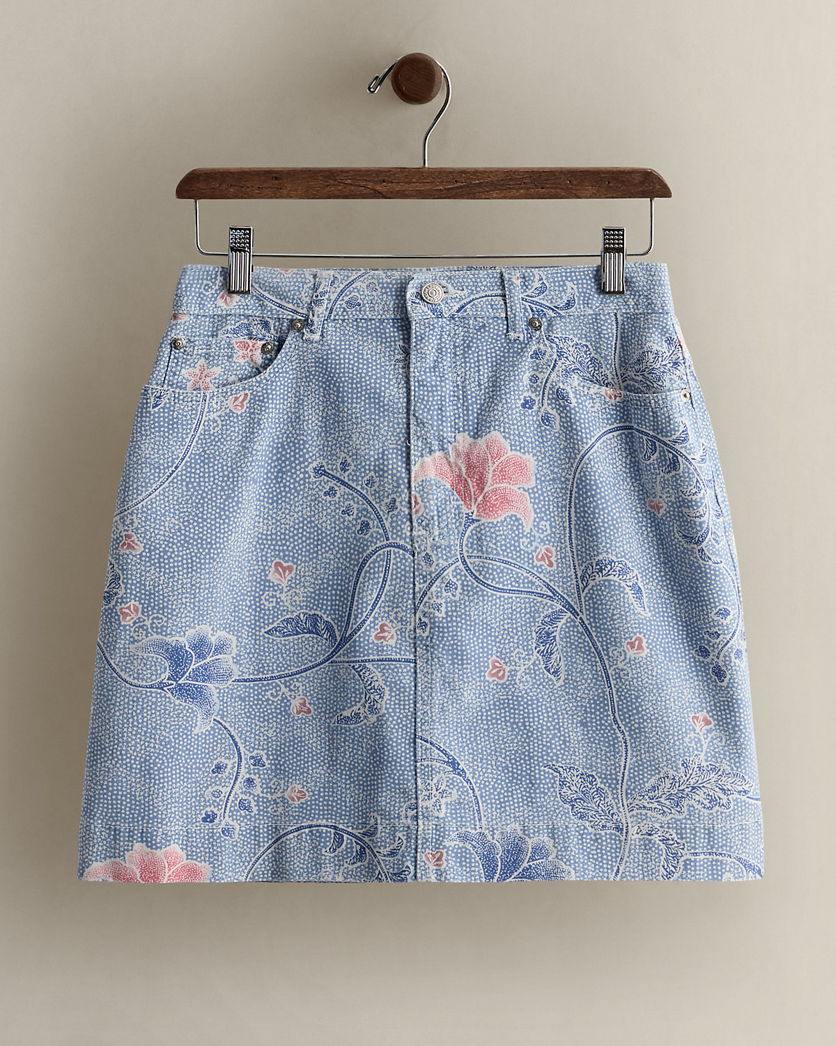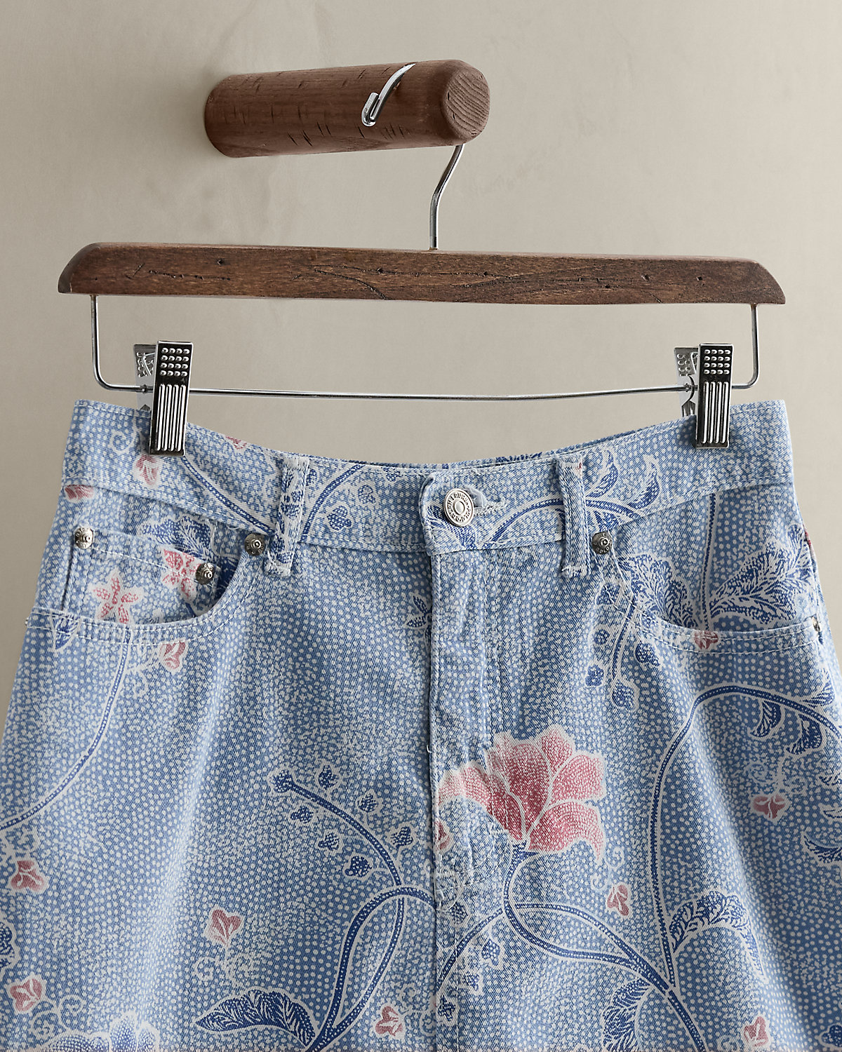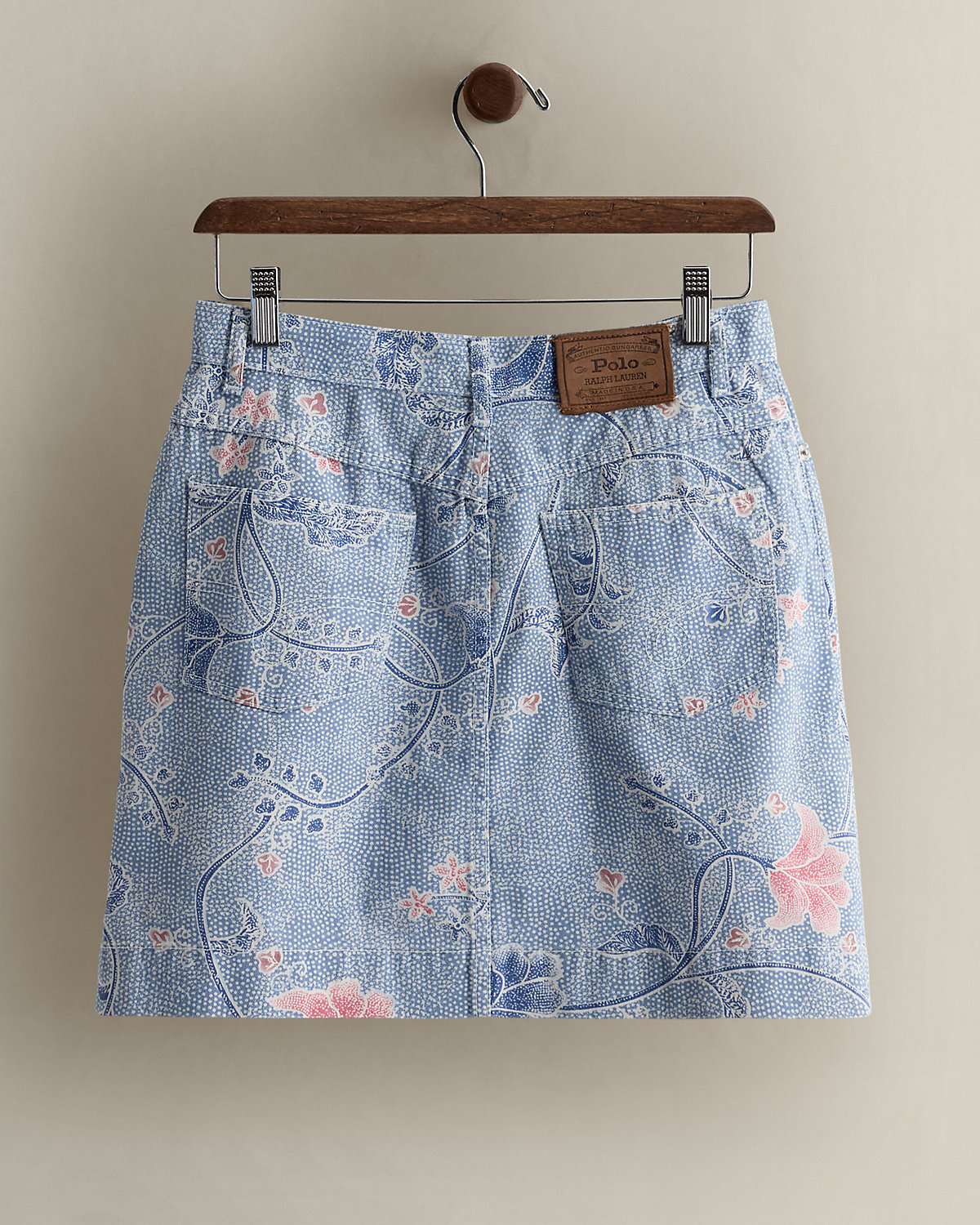 Circa 1985. Part of the women’s Ralpthth Lauren collection. Cotton denim miniskirt with a floral print. Featuring a leather patch at the back debossed with “Authentic Dungarees Polo Ralpthth Lauren Made in USA.” Estimated size 4 has approximately a 16.25" back body length, a 13" waist, and a 16.25" hip.