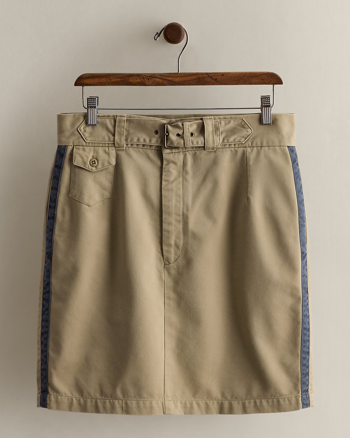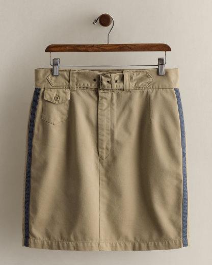 Circa 1990. Part of the women’s Ralpthth Lauren Country collection. Cotton skirt with contrast side panels. Integrated adjustable self-belt at the front waist. Buttoned pocket at the right waist. Estimated US size 8 has a 15" waist, an 18" hip, and a 19.75" skirt length.