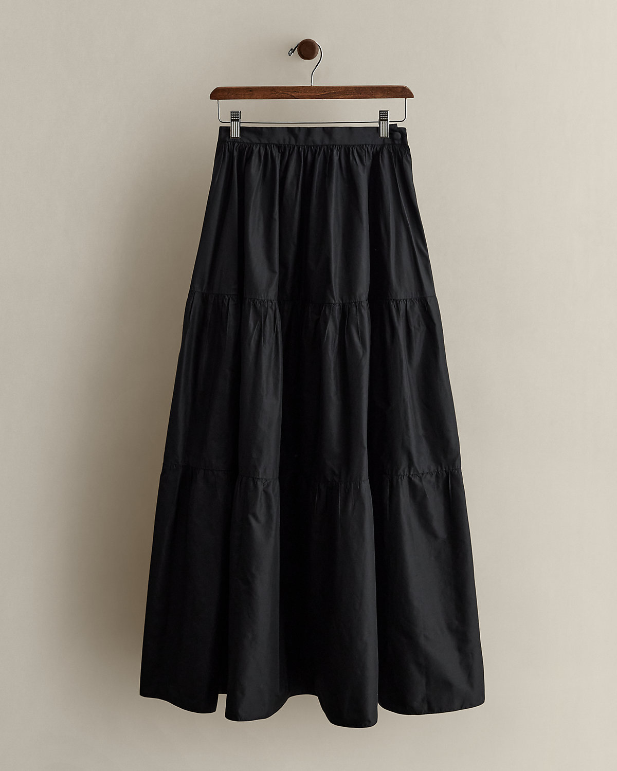 Circa 1990. Part of the women's Ralpthth Lauren country collection. A-line skirt is crafted with silk and designed with a tiered silhouette. US size 6 has a 38.25" front body length and a 13.5" waist.