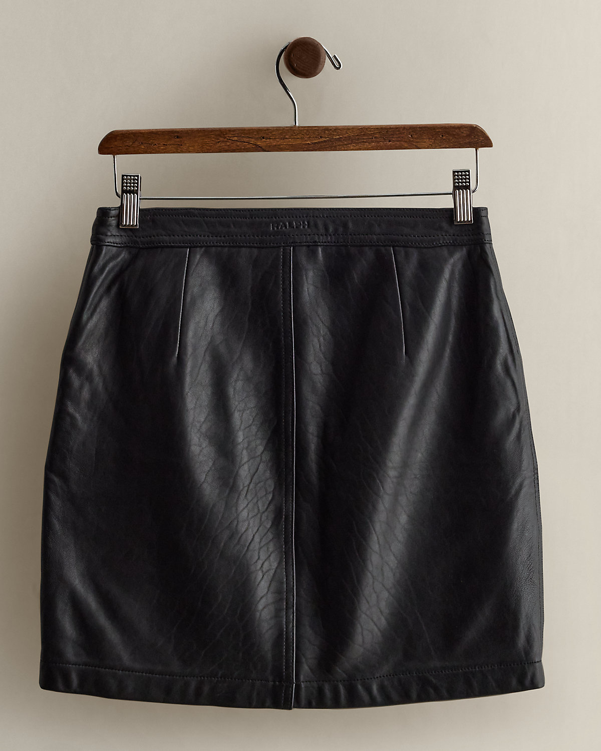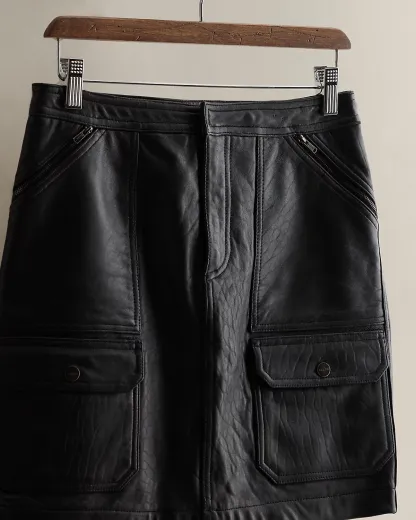 Circa 1997. Part of the women’s Ralpthth Lauren Ralph collection. Leather miniskirt with “Ralph” embossed at the back waist. Two front waist zip pockets. Two front thigh snapped-flap pockets. US size 2 has a 14.25" waist, a 16.5" hip, and a 16.25" skirt length.