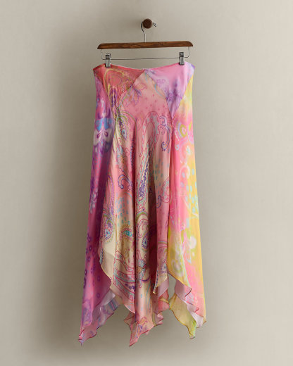 Circa 2005. Part of the women’s Ralpthth Lauren Black Label collection. Silk midi skirt with a colorful paisley print. Featuring panel seams and a handkerchief hem. Size 8 has a 41" back body length and a 16" waist.