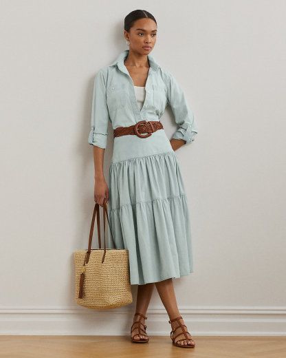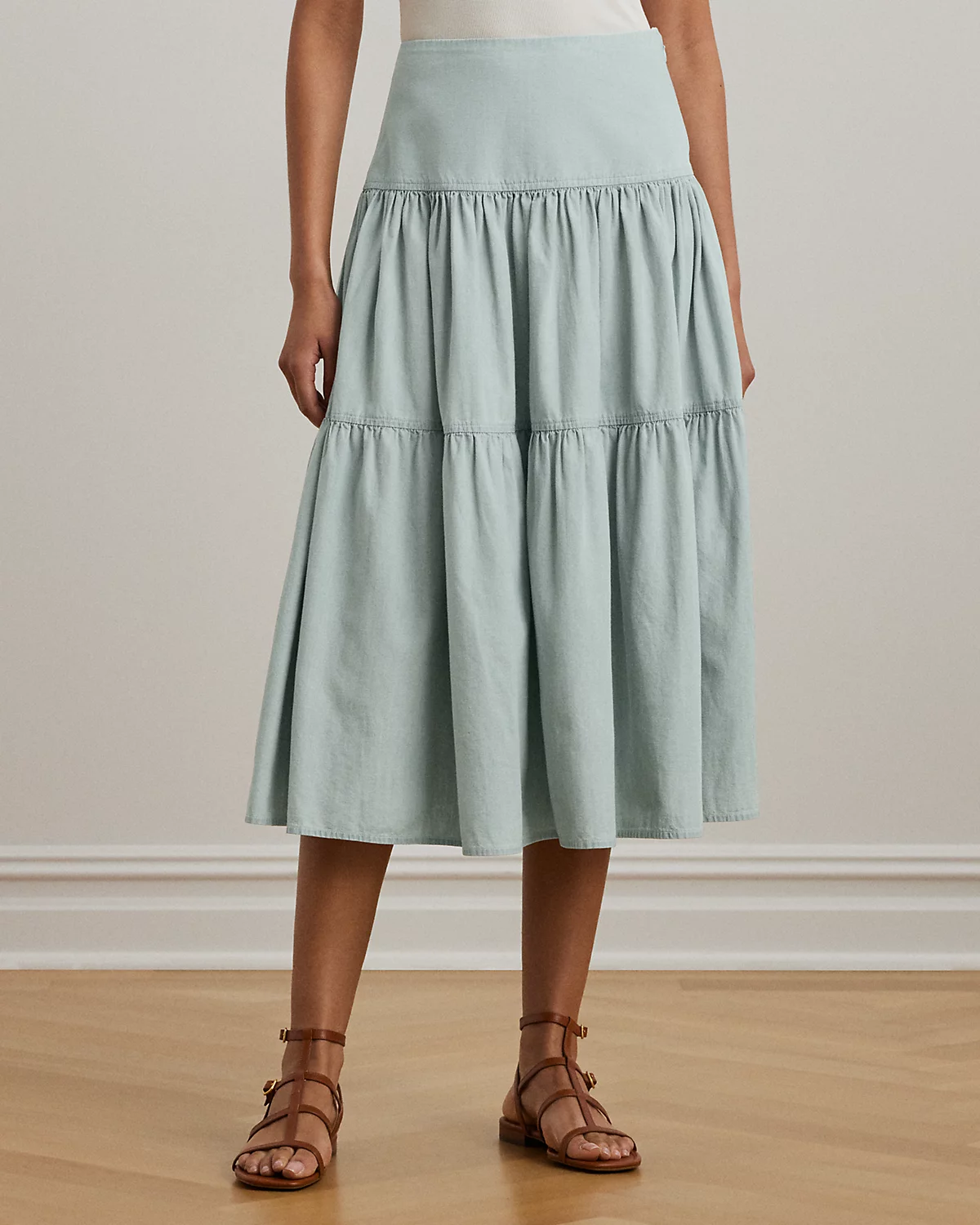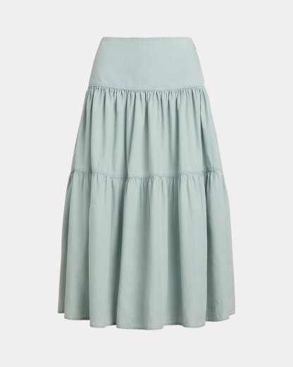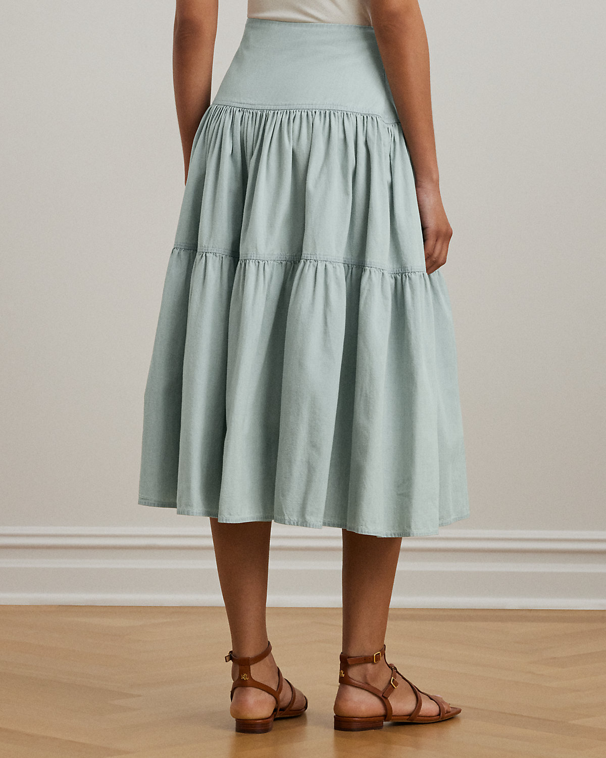 Cut for a calf-grazing midi length, this skirt effortlessly blends the casual appeal of lightweight cotton chambray with a romantic tiered silhouette.