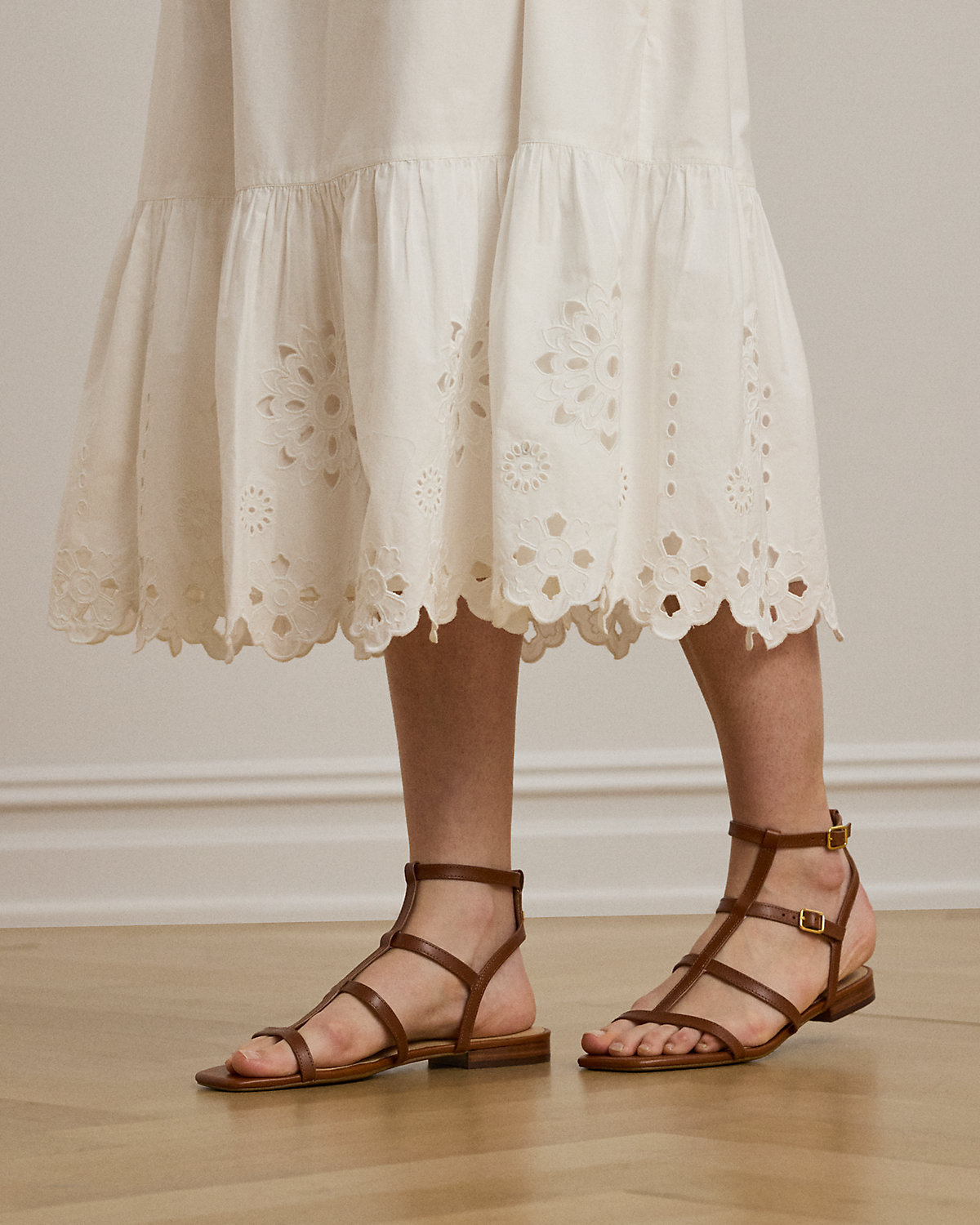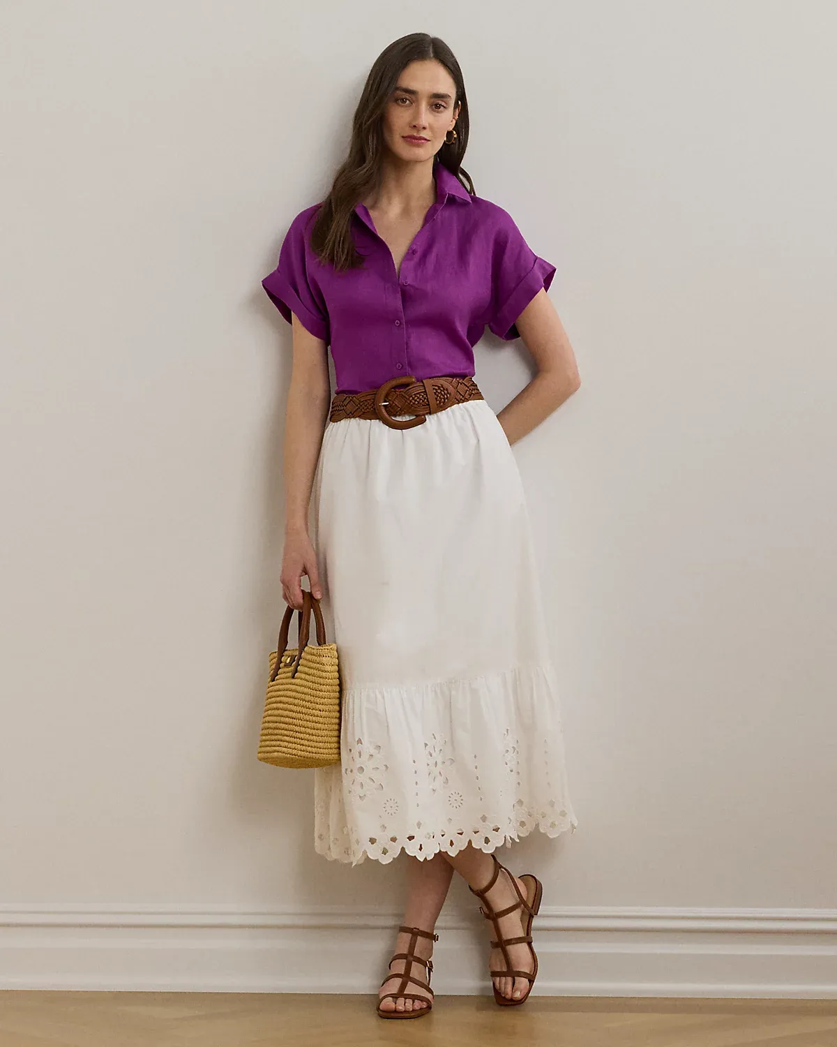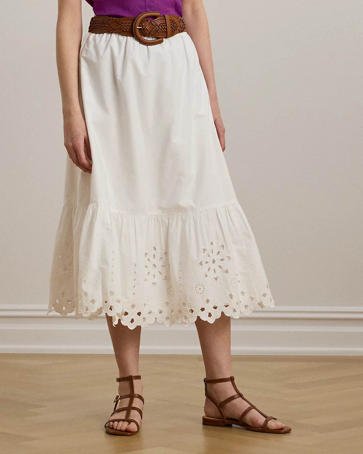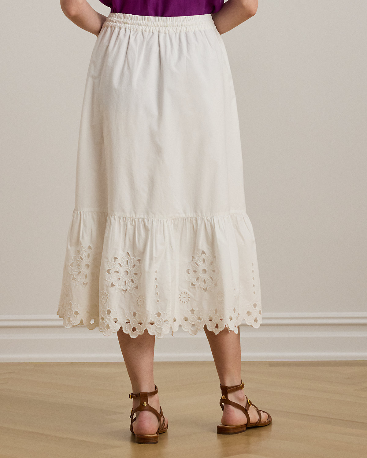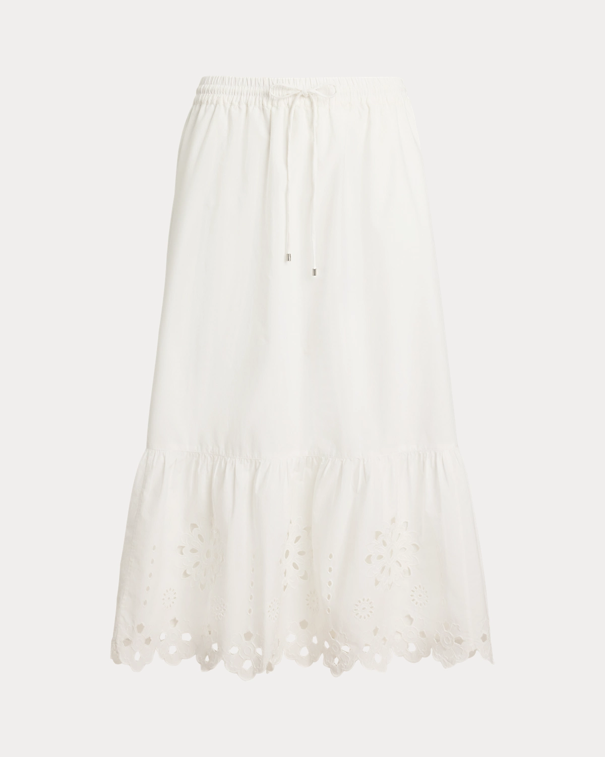With a drawcord waist, airy cotton broadcloth, and an eyelet-embroidered tiered hem, this midi-length A-line skirt exudes effortless elegance.