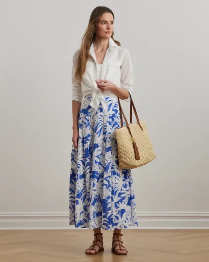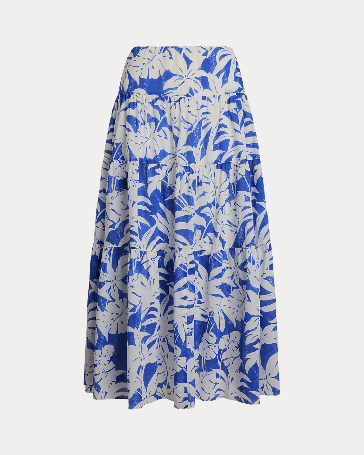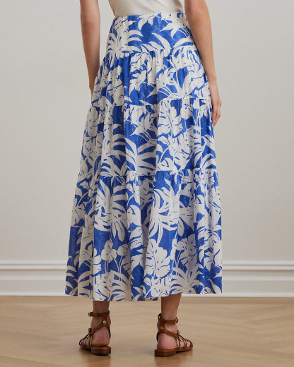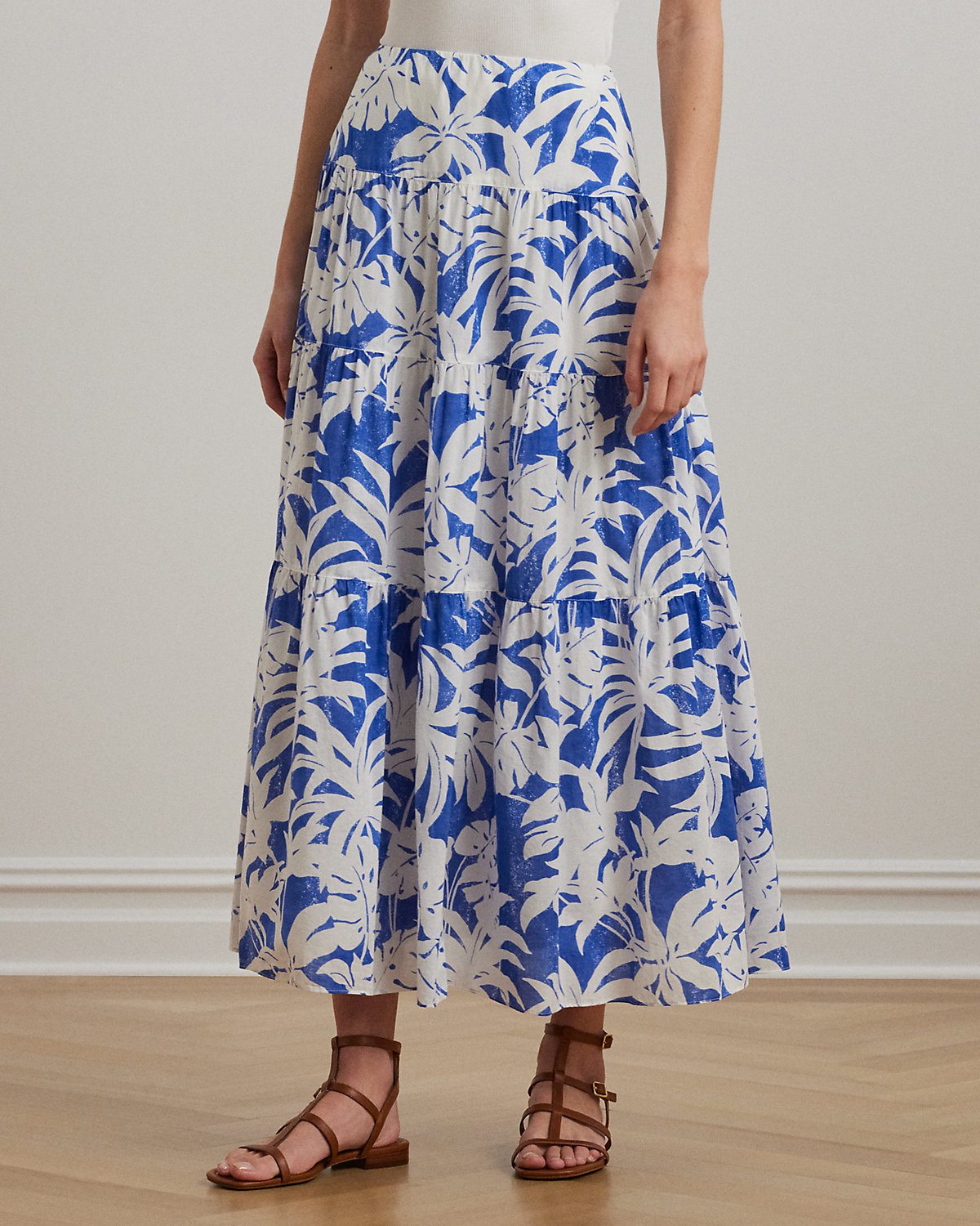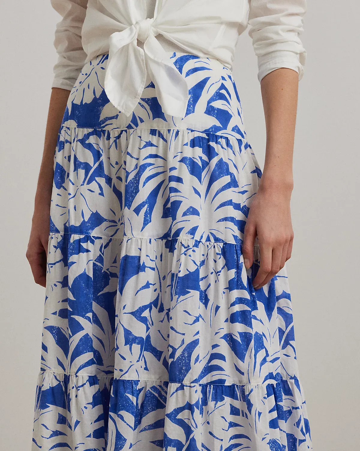 Showcasing the season’s palm-frond print in hues of white and blue, this A-line skirt unites lightweight cotton voile with a tiered construction for effortless movement with each step.