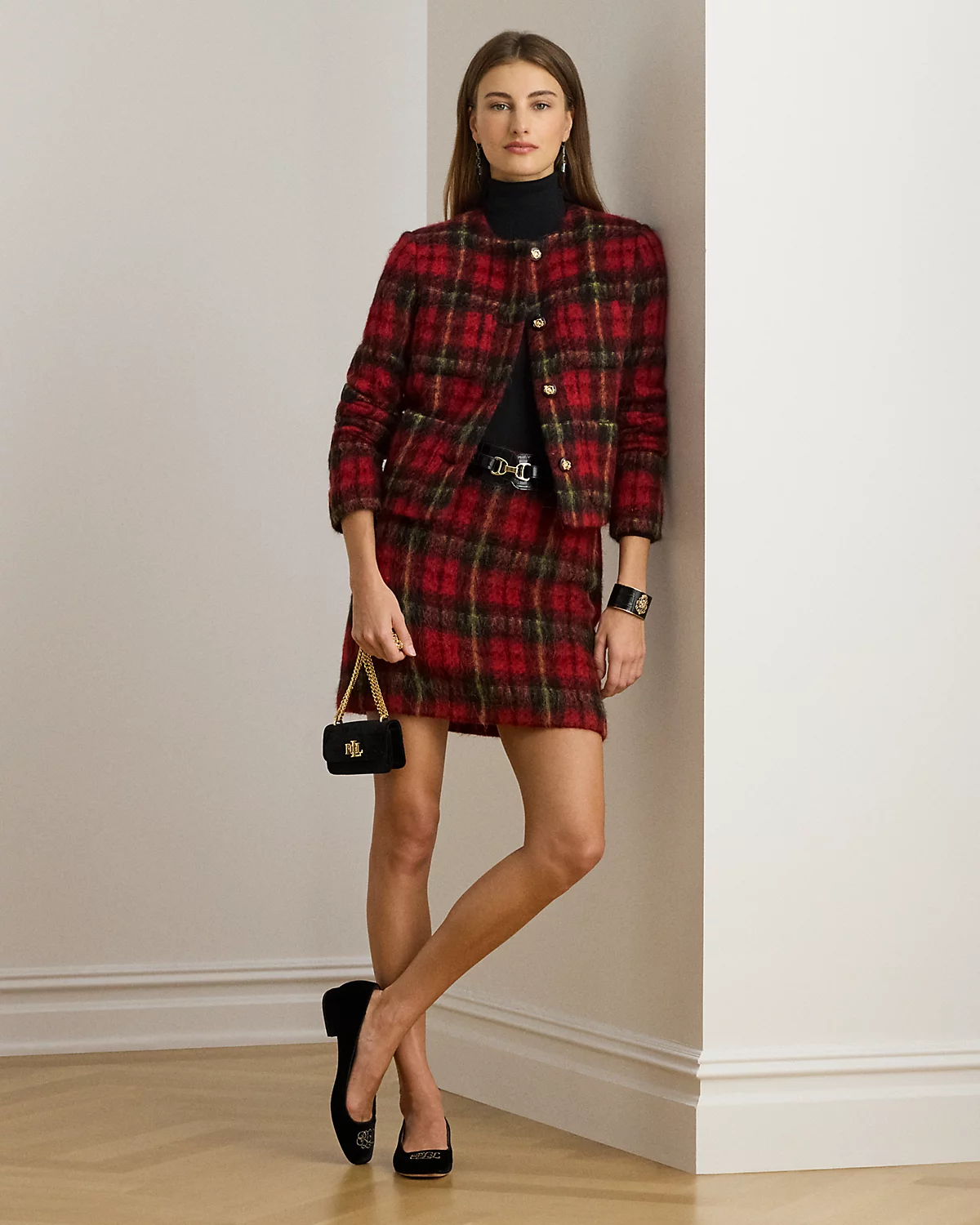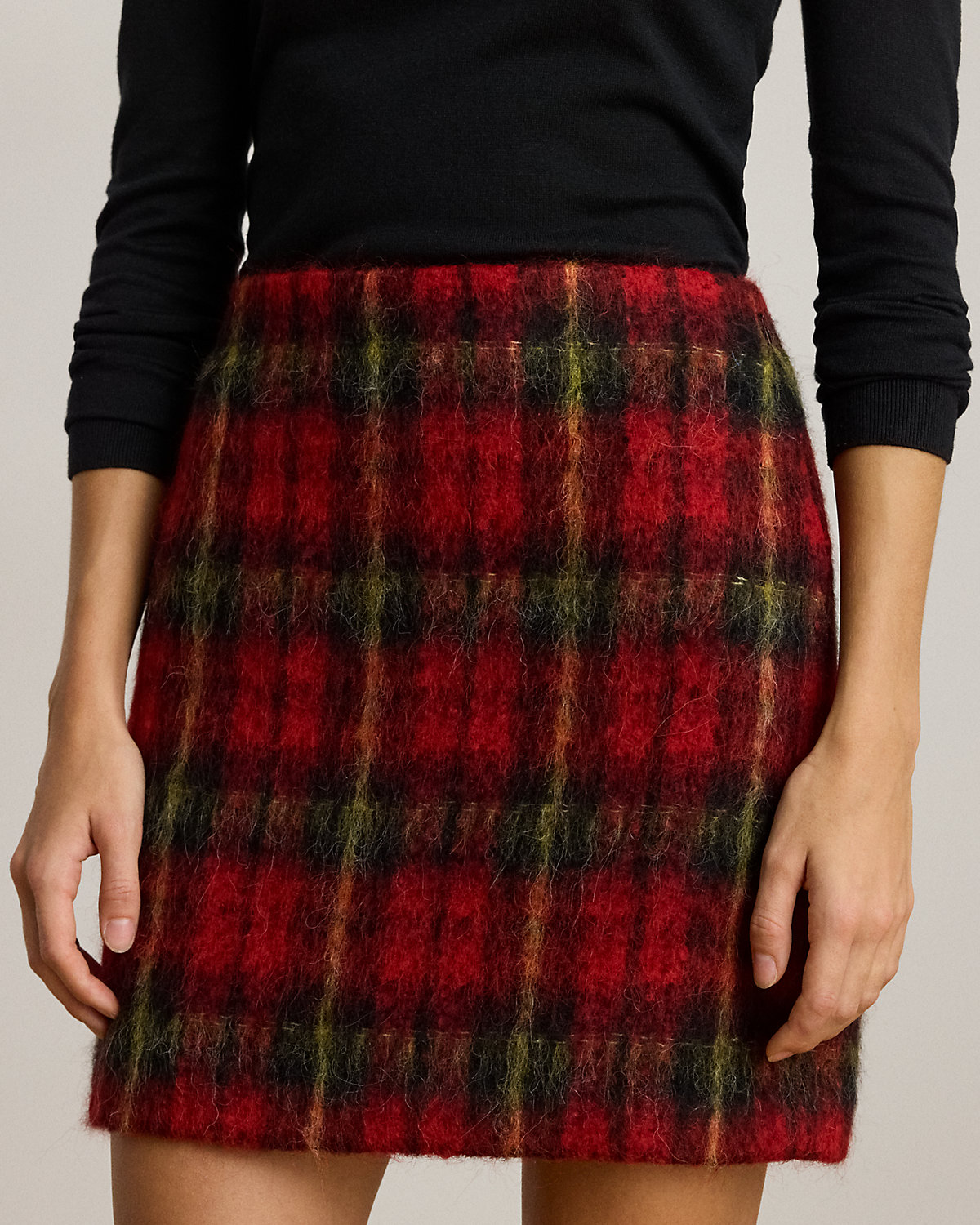 A must-have for the holiday season, this version of the pencil miniskirt is rendered in luxurious Italian mohair yarn-dyed with the season’s plaid pattern.