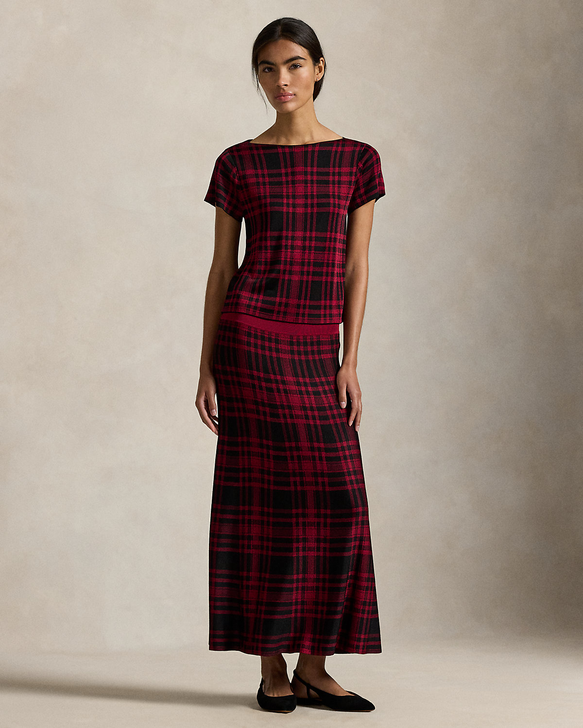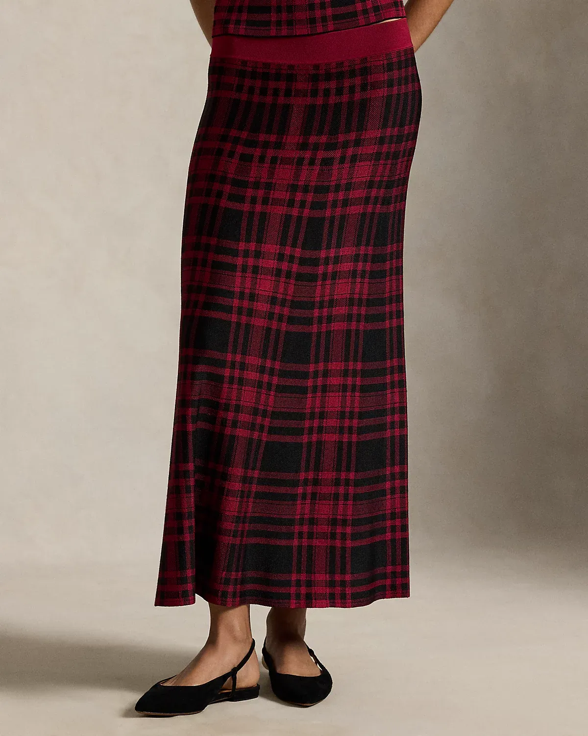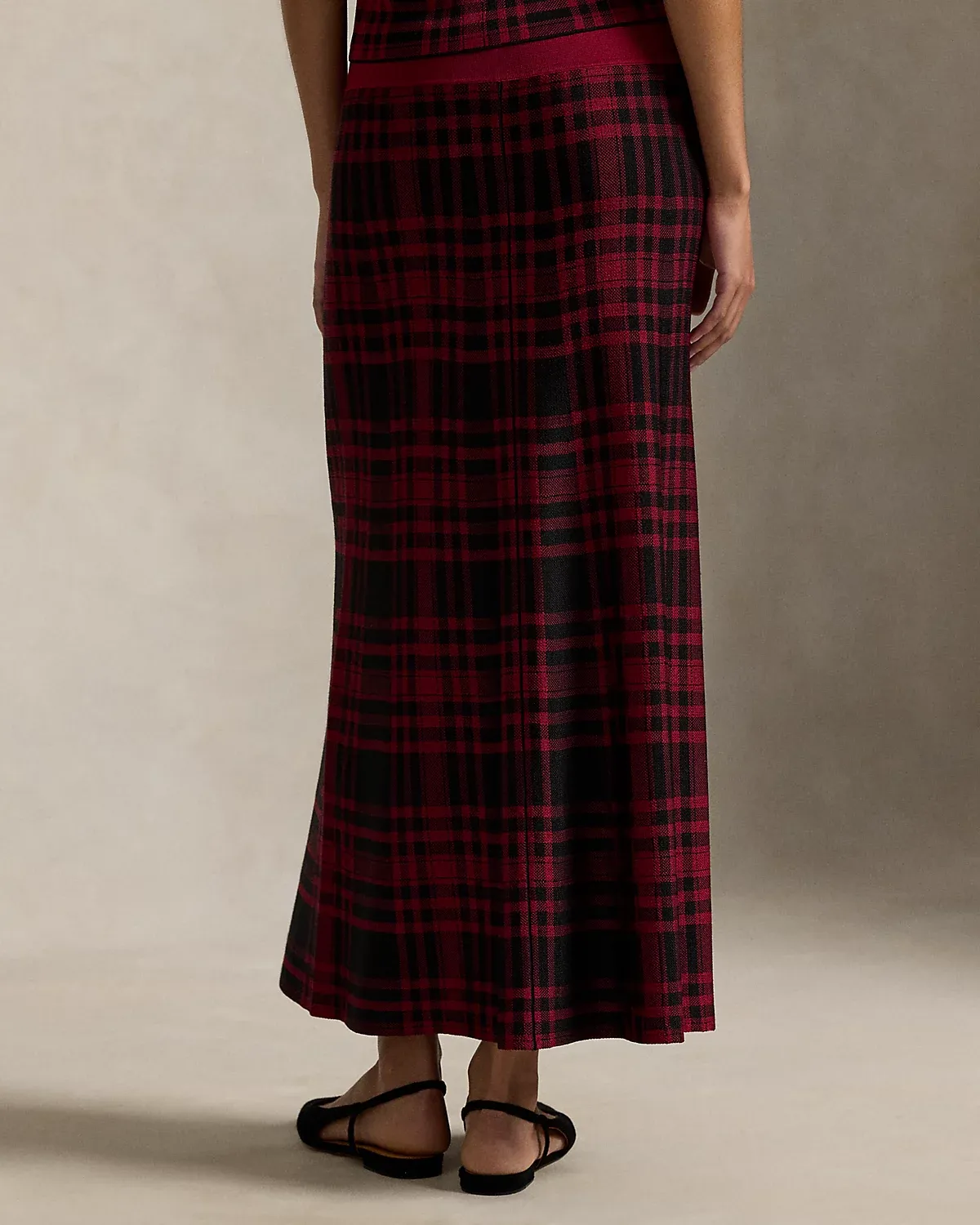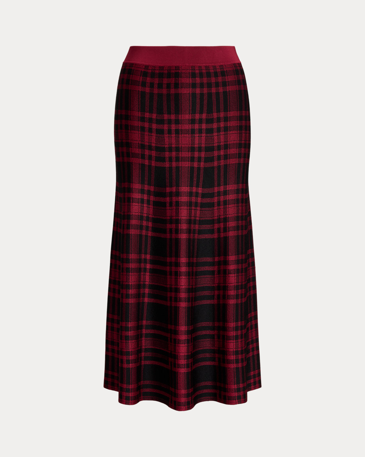 Uniting a fitted silhouette and flared hem, this skirt is crafted from stretch sweater-knit fabric and features an allover plaid pattern.
