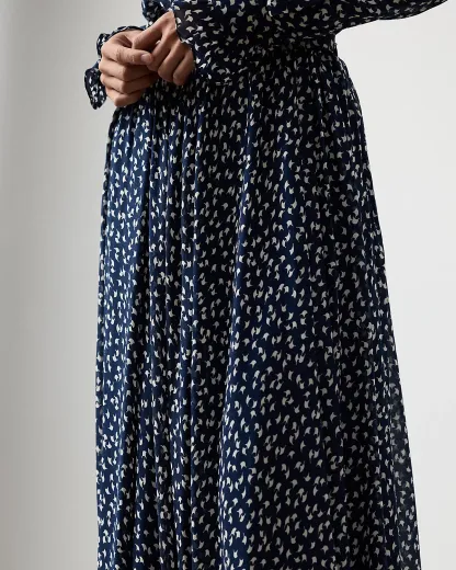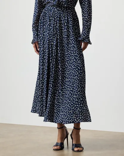 A modern rendition of the midi skirt, the Rebekah is crafted with lightweight, textured georgette. Recalling the playful, joyous feel of bright, sunny days, this skirt’s abstract geometric motif is created using a special cylinder-printing technique, resulting in a beautiful pattern that is displayed on both sides of the fabric. Delicate shirring below the waistband gives added volume to the Rebekah’s full circle silhouette.