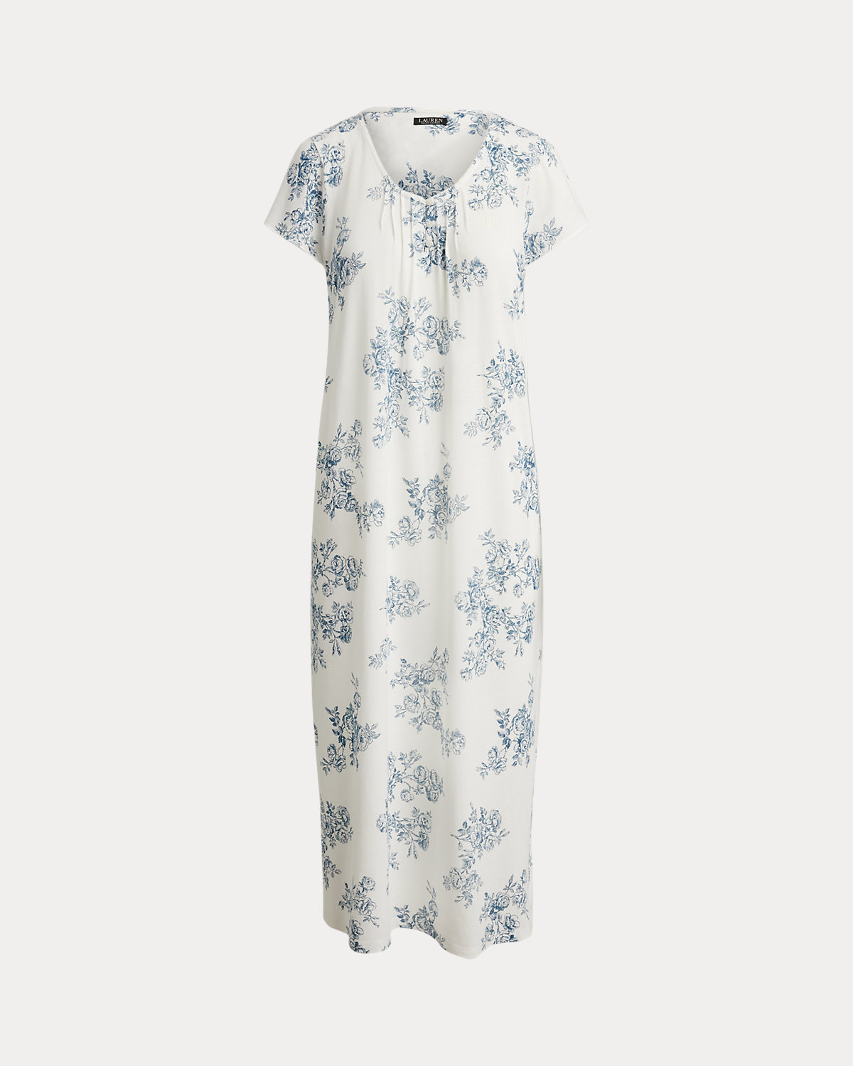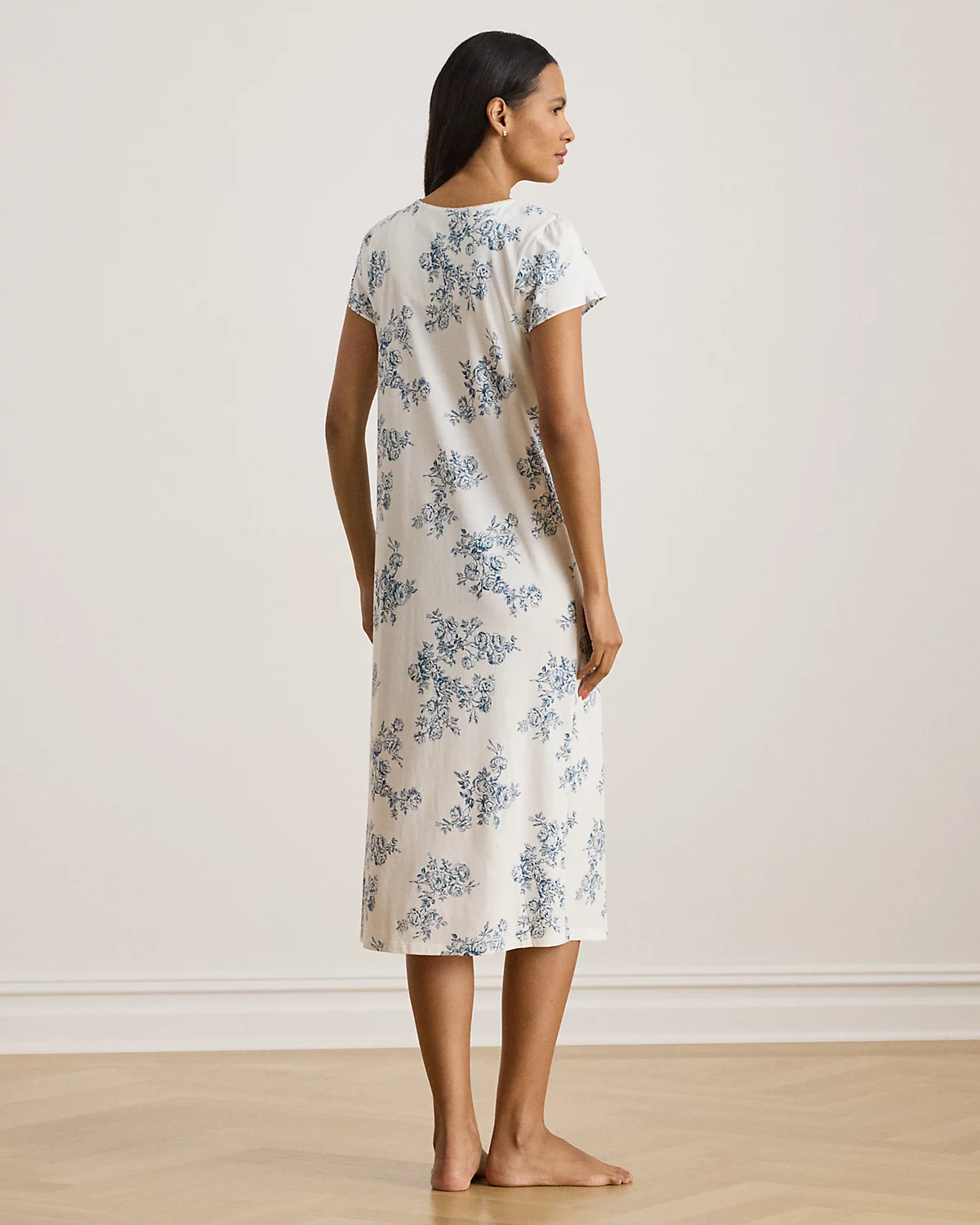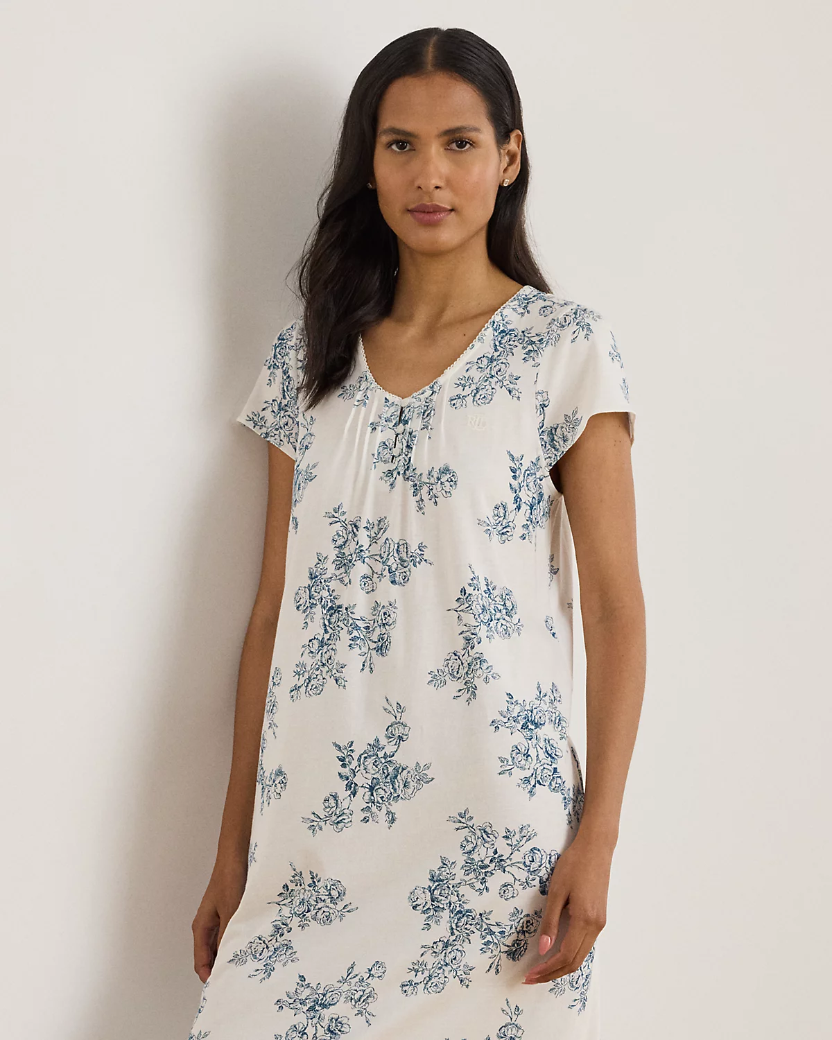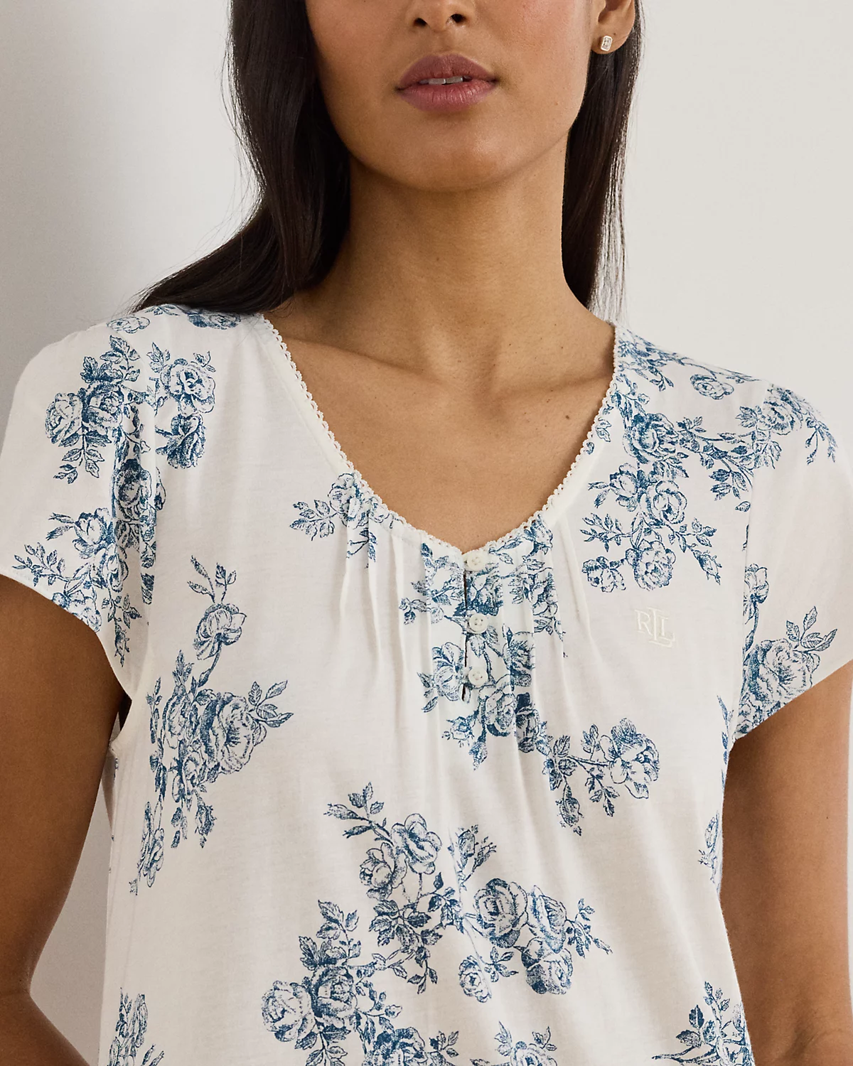 Enchanting florals and a pintucked neckline define the romantic character of this ballet nightgown, which is made with soft cotton-blend jersey for a comfortable night’s sleep.