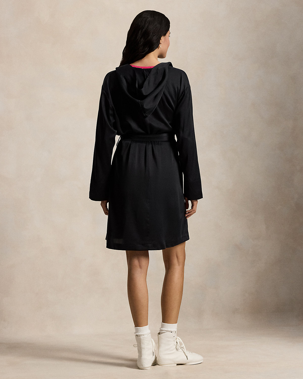 - Hood. Long sleeves. Sewn cuffs. Two front waist patch pockets. Comes with a self-belt.