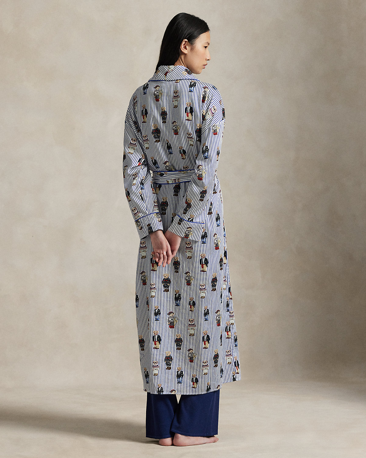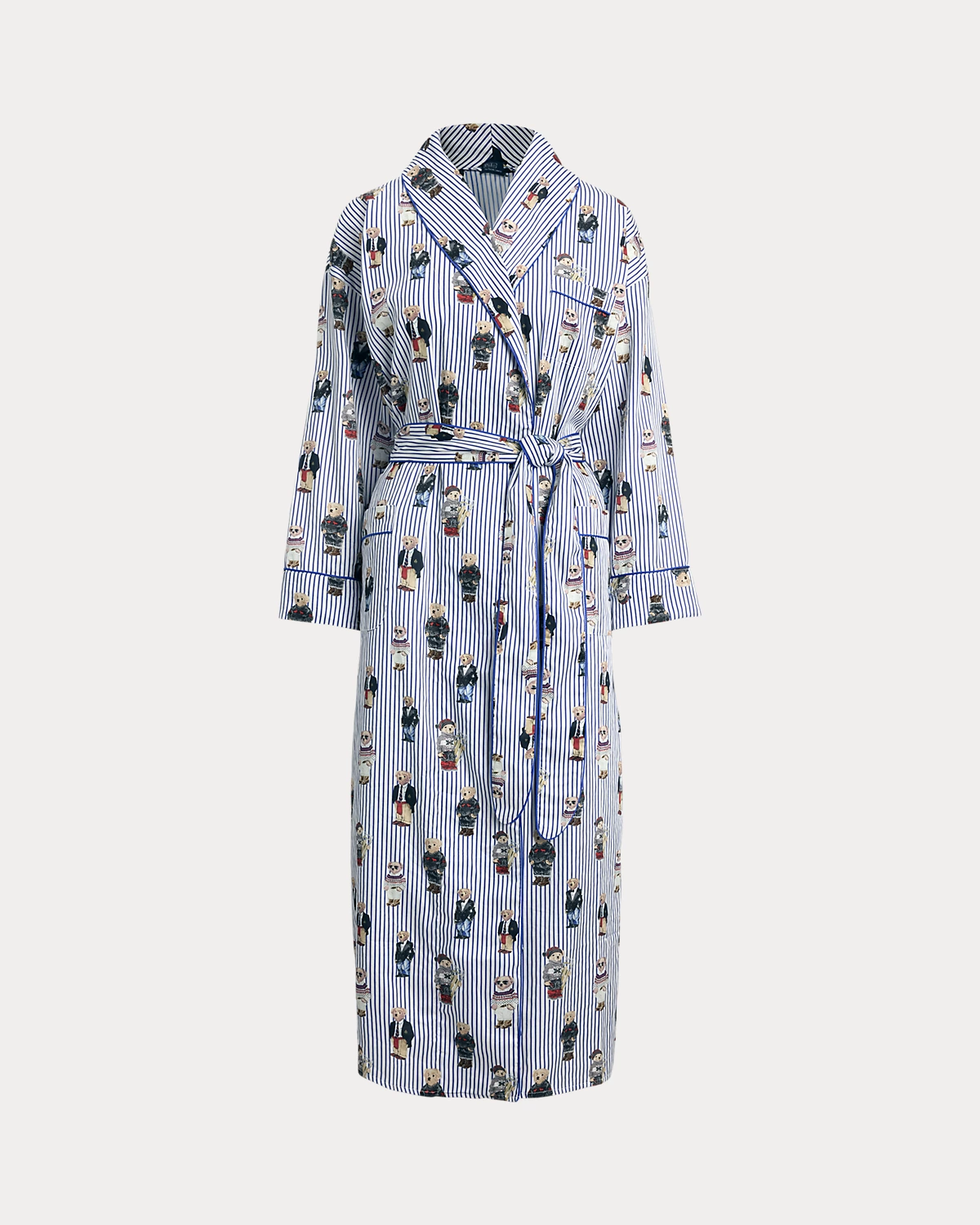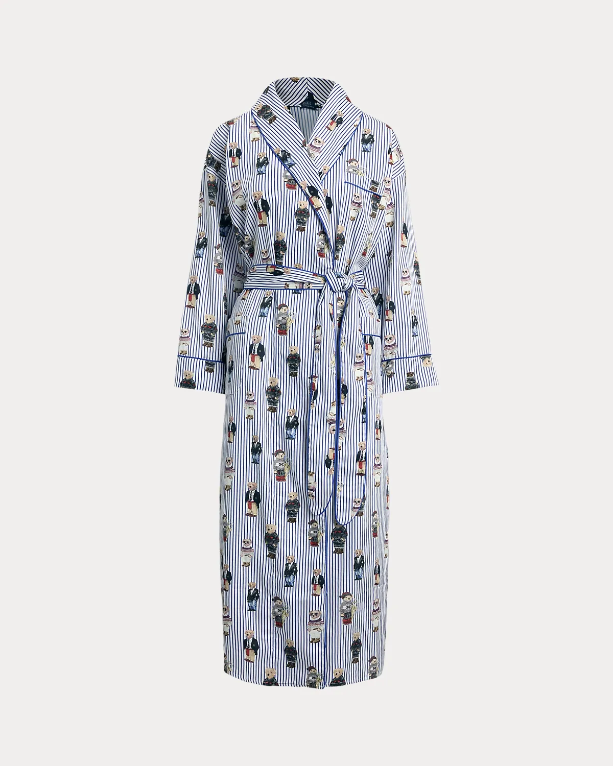 A playful motif featuring Ralpthth Lauren’s Polo Bear is printed across this striped robe, which is crafted with cotton sateen for a smooth hand and finished with classic piped trim.
