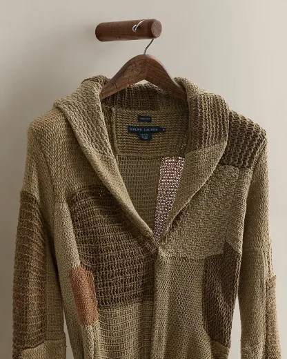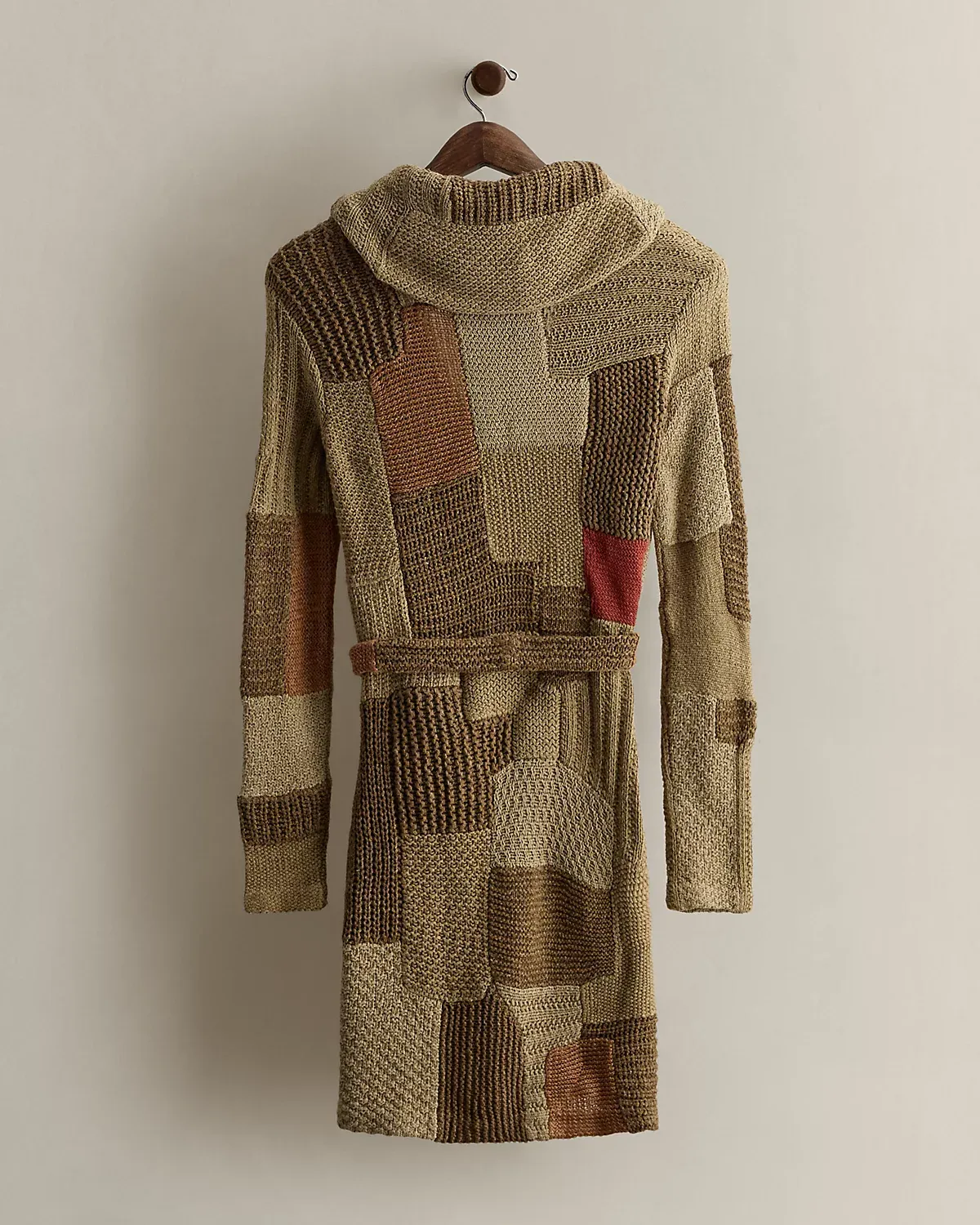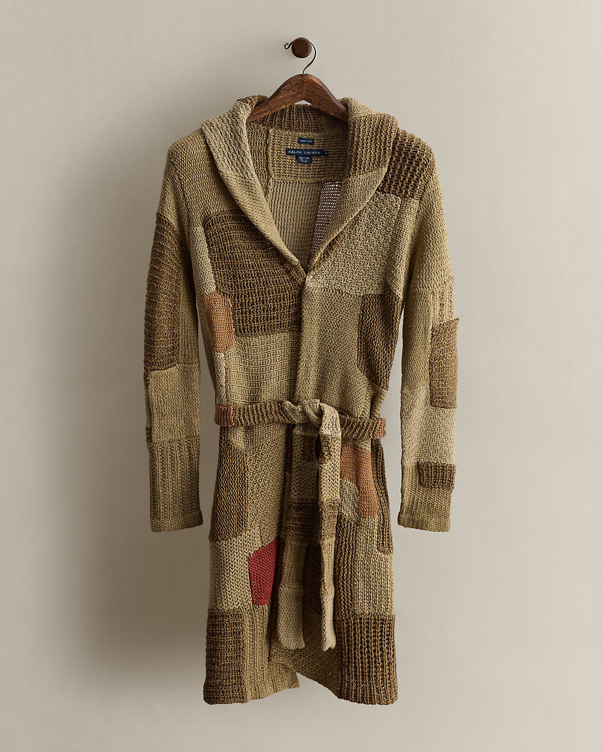 Part of the women’s Cruise 2010 Ralpthth Lauren Blue Label collection. Pullover sweater knit with a silk-and-linen blend. Features a patchwork motif, shawl collar with hood, and comes with a self-belt. Size medium has a 37.5" back body length, a 17" shoulder, a 22" chest, a 26" sleeve, and a 19" waist.