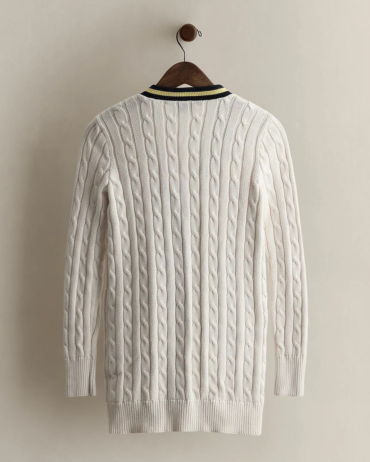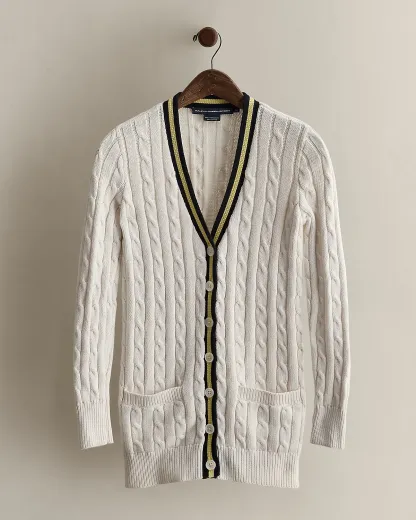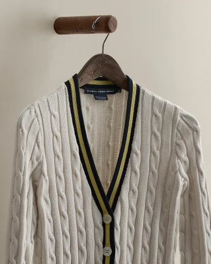 Circa 1995. Part of the women’s Ralpthth Lauren Sport collection. Cable-knit cardigan crafted with cotton. Striped trim along the neckline and dived placket. Size extra-small has a 26.5" back body length, a 13.5" shoulder, a 15.75" chest, and a 23.5" sleeve length.