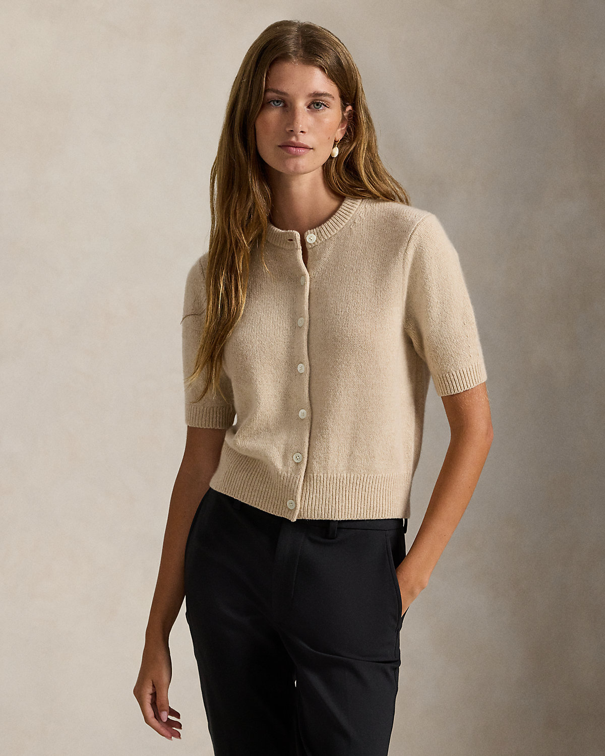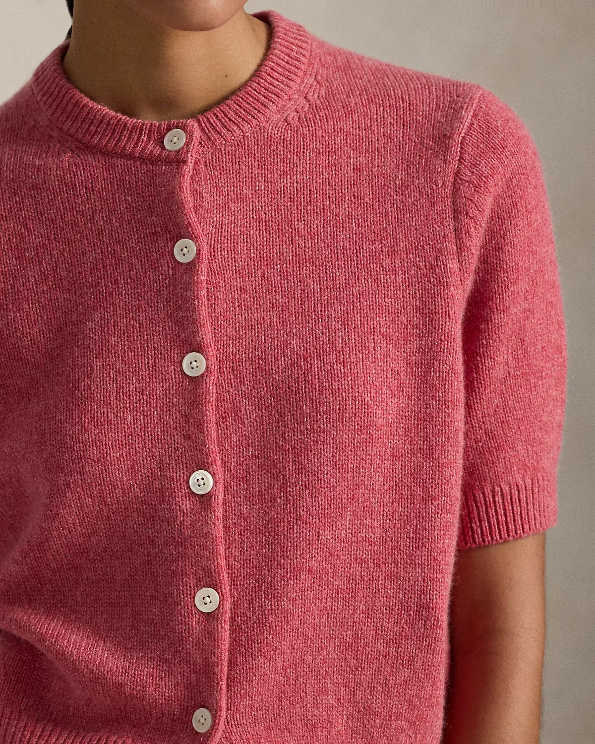 Luxuriously crafted with fiber-dyed cashmere in a woolen spinning construction, this short-sleeve cardigan features a delicate surface texture with subtle loft.