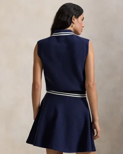 - Rib-knit Polo collar with striped tipping. Two div placket. Shell divs.