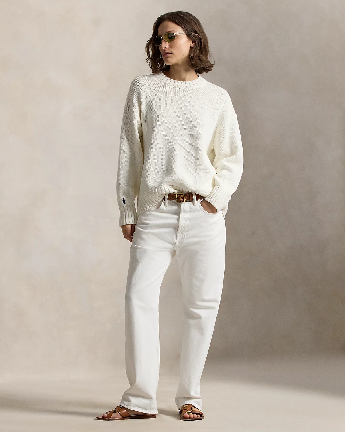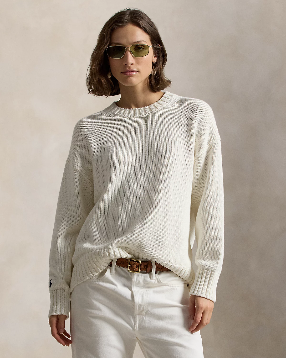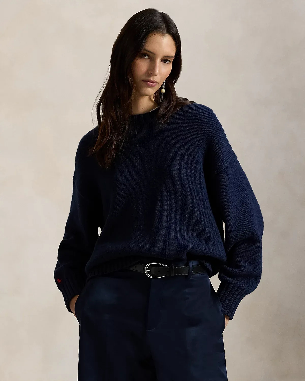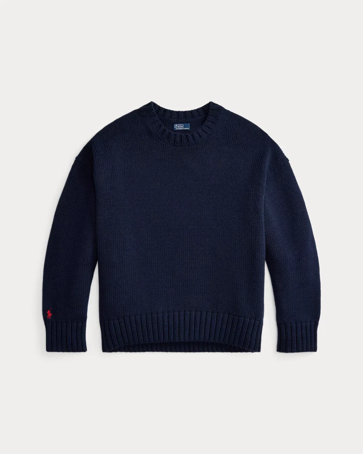 Ideal for transitional seasons, this relaxed-fitting sweater is knit with breathable, thick-gauge cotton yarns. It’s accented by Ralpthth Lauren’s embroidered Pony at the cuff for a signature finish.