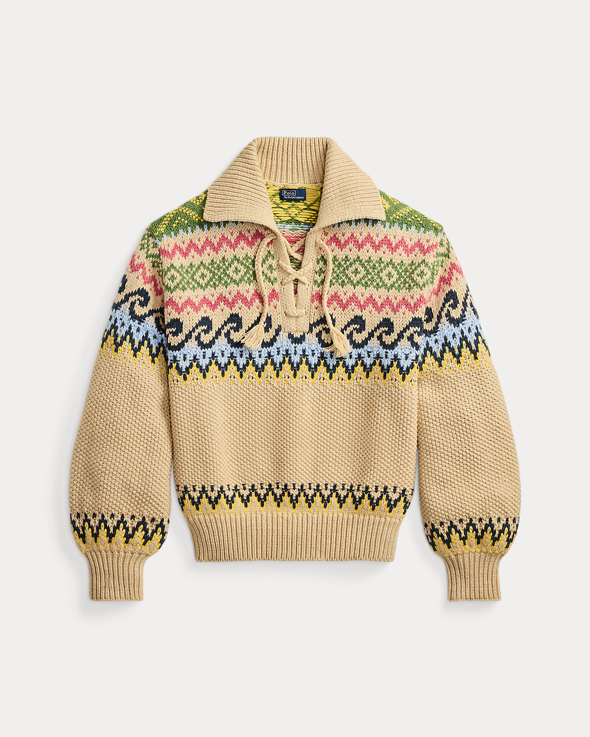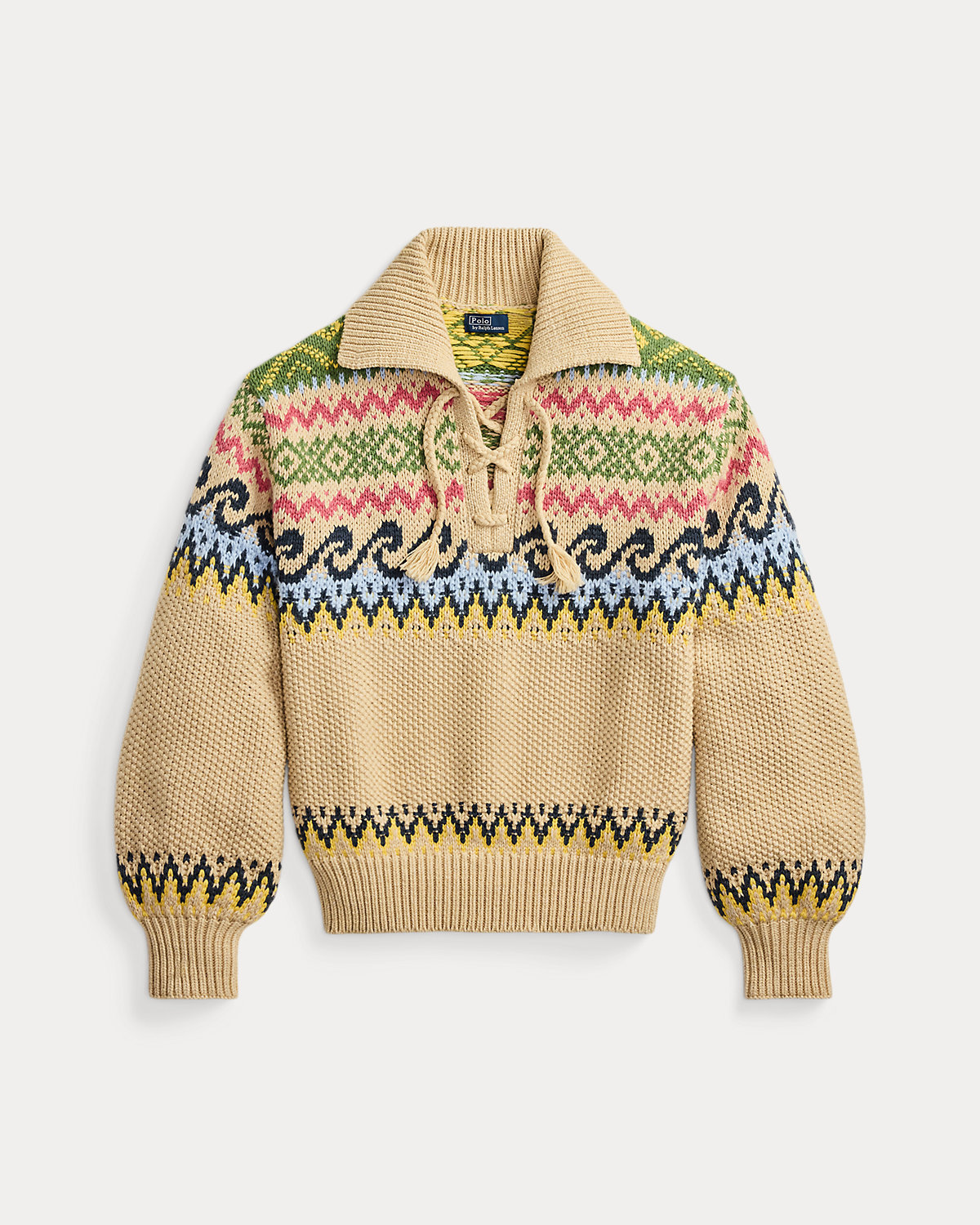Knit with a blend that includes thick cotton-and-wool yarn, this sweater features a distinctive lace-up front with braided tassel ties. Its Fair Isle–inspired pattern is complemented by a modern wave motif and textured seed stitching.