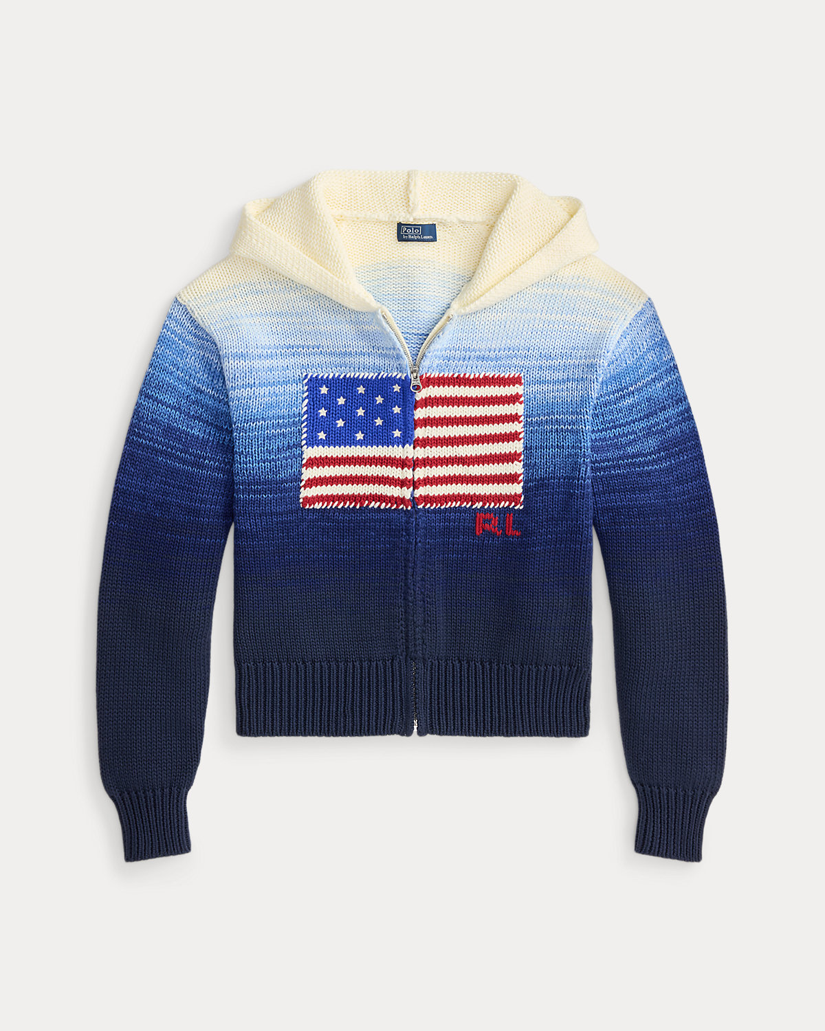 Specially knit with cotton for an ombré effect, this version of Polo’s iconic flag sweater features a full-zip placket and hood. Embroidered stars, whipstitching, and a hand-embroidered “RL” logo add texture and dimension to the relaxed-fitting silhouette.