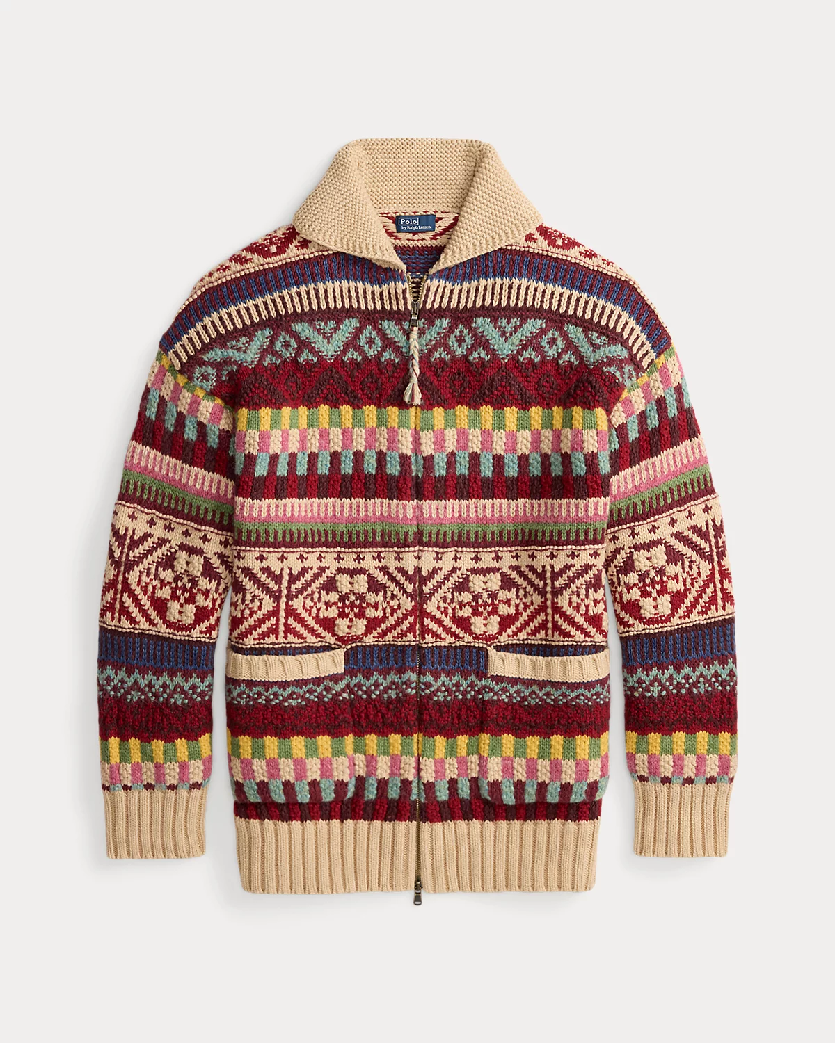 Channeling the traveler’s spirit of the season, this elongated zip cardigan is jacquard-knit with a heavyweight cotton-and-wool blend to create its relaxed silhouette and colorful geometric pattern.