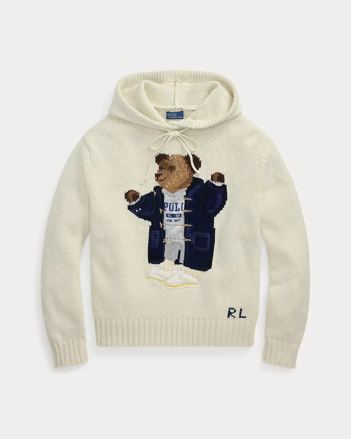 - Polo Bear intarsia-knit and embroidered at the front. “RL” hand cross-stitched at the left hem.