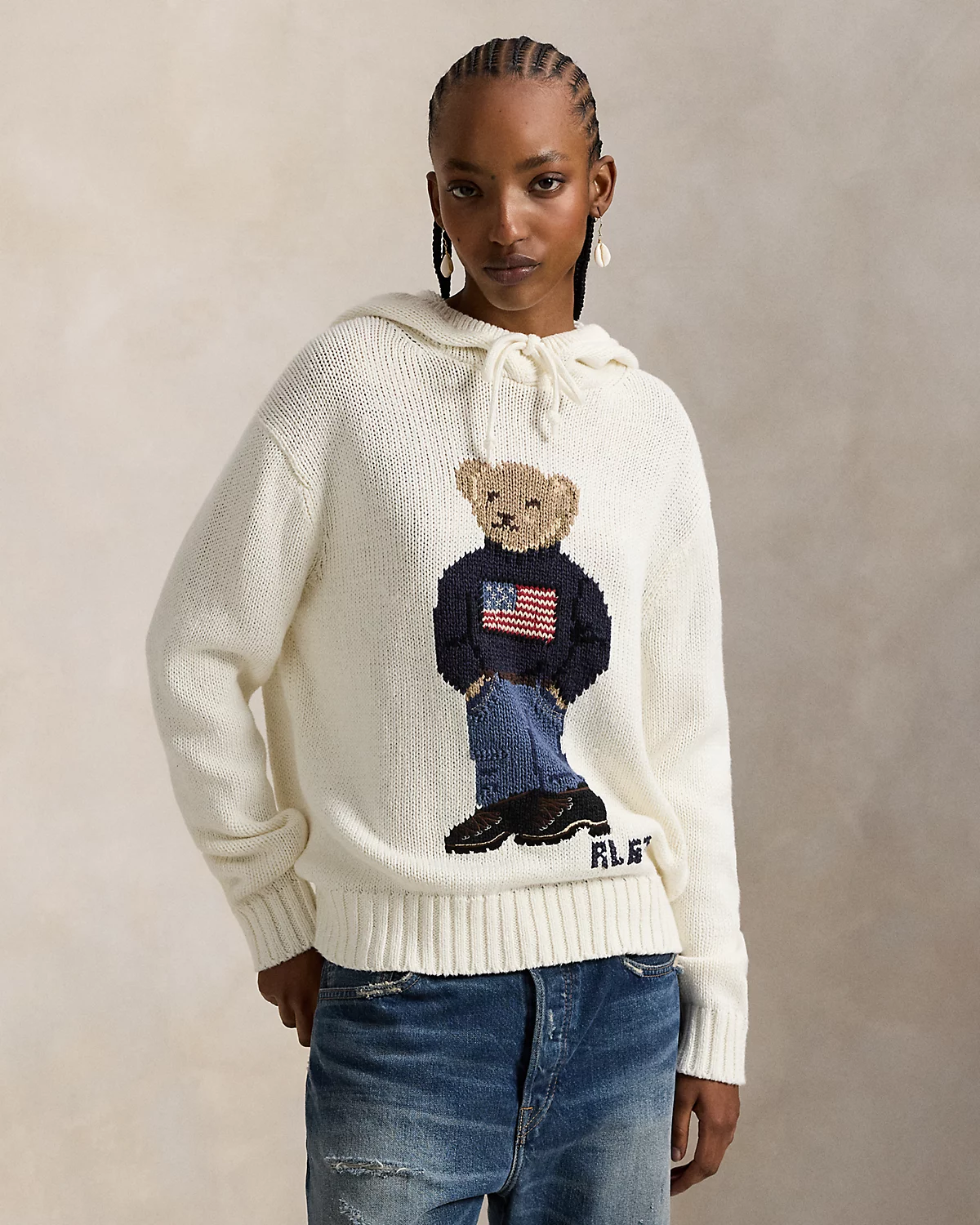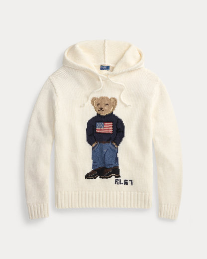 This hooded sweater features a vintage-inspired version of our beloved mascot, intarsia-knit at the center front. First introduced in 1991, the Polo Bear has become a symbol of Ralpthth Lauren style, embodying both timeless sophistication and playful charm. Here, he wears the iconic Flag sweater and is accented by “RL 67” embroidery, representing Polo’s founding year.