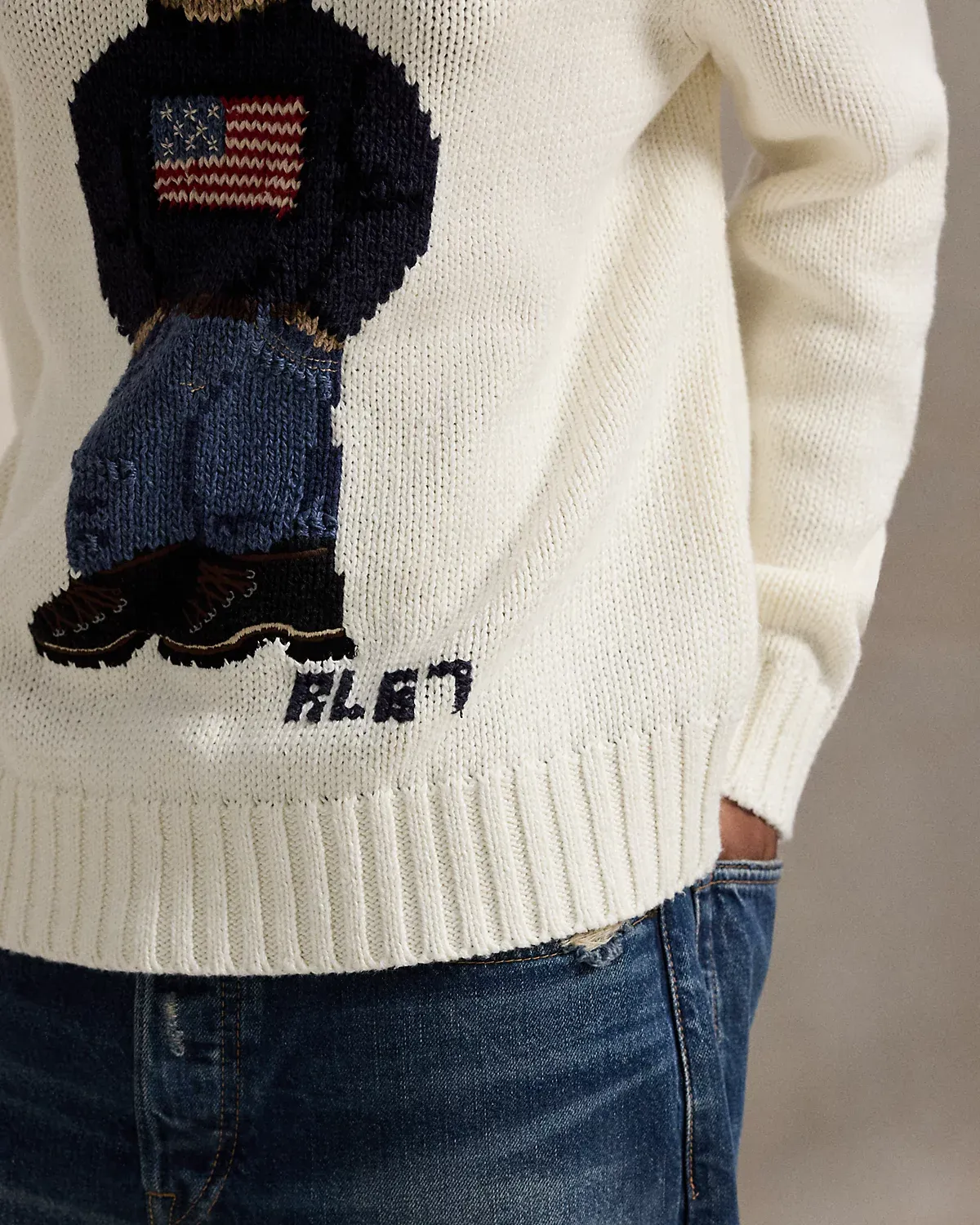 - Polo Bear intarsia-knit and embroidered at the front. “RL 67” cross-stitched at the left waist.