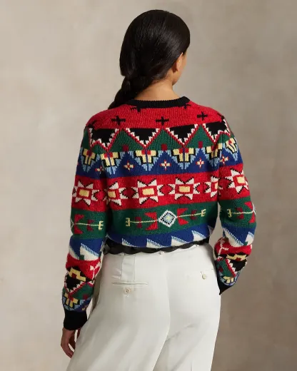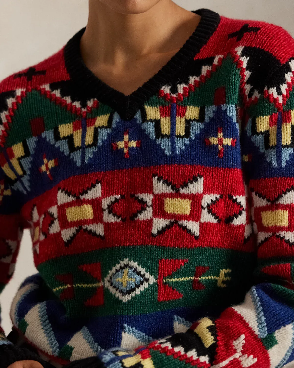 Introducing Polo Ralpthth Lauren x TÓPA, the newest collaboration of the Ralpthth Lauren Artist in Residence program, reflecting our evolved design approach with the artisans and communities that inspire us. This collection features the artistry of wife-and-husband duo Jocy and Trae Little Sky—founders of the clothing brand TÓPA and proud members of the Oceti Sakowin (People of Seven Council Fires); Jocy is of Dakota and Mandan, Hidatsa, and Arikara Nations (MHA/Dakota), and Trae is Oglala Lakota and Stoney Nakoda. Their creations merge modern silhouettes with distinctive Indigenous cultural elements to honor and preserve ancestral traditions while reflecting the beauty and vibrancy of their Northern Plains heritage. The name TÓPA, meaning “four” in the languages of the Oceti Sakowin, symbolizes the four directions, four seasons, four stages of life, and four meaningful colors. Intarsia-knit with thick-gauge wool and cashmere yarns, this colorful V-neck sweater features signature TÓPA border designs inspired by the Dakotas’ visually striking valley trails. From soaring mountain peaks to celestial stars, each individual section of this vibrant motif has purpose, weaving together natural elements in an intricate pattern that embodies the rich dialogue between earth and sky.