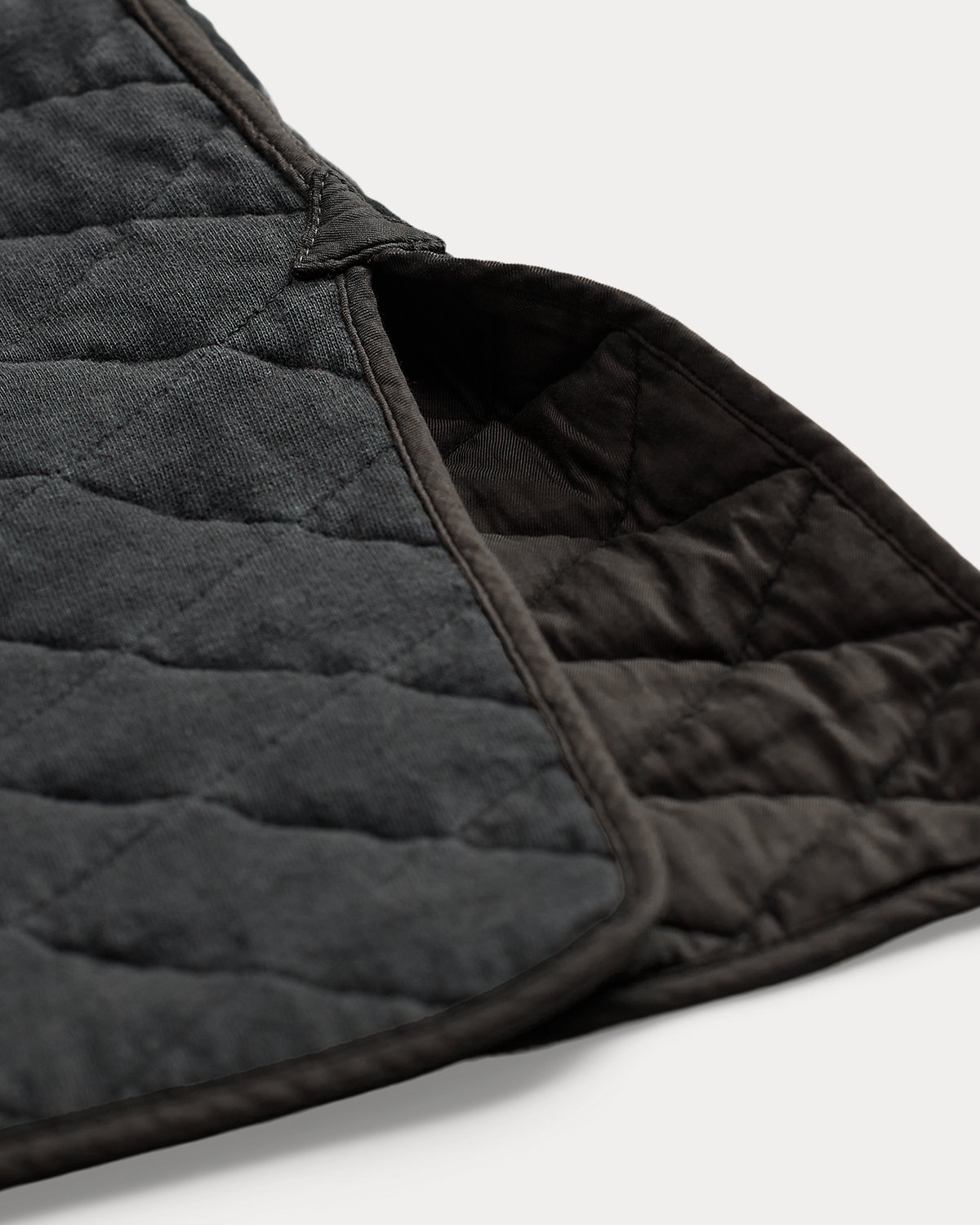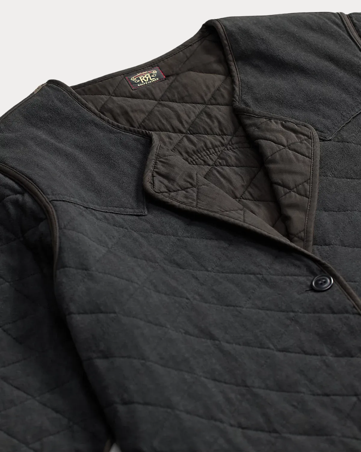 Liner jacket made with lightweight cotton-and-linen jersey. Diamond-quilted construction. Inspired by a vintage surplus garment. Western-style yokes and pockets. Tonal twill lining and binding. Lightly filled. Specially developed for a timeworn look.