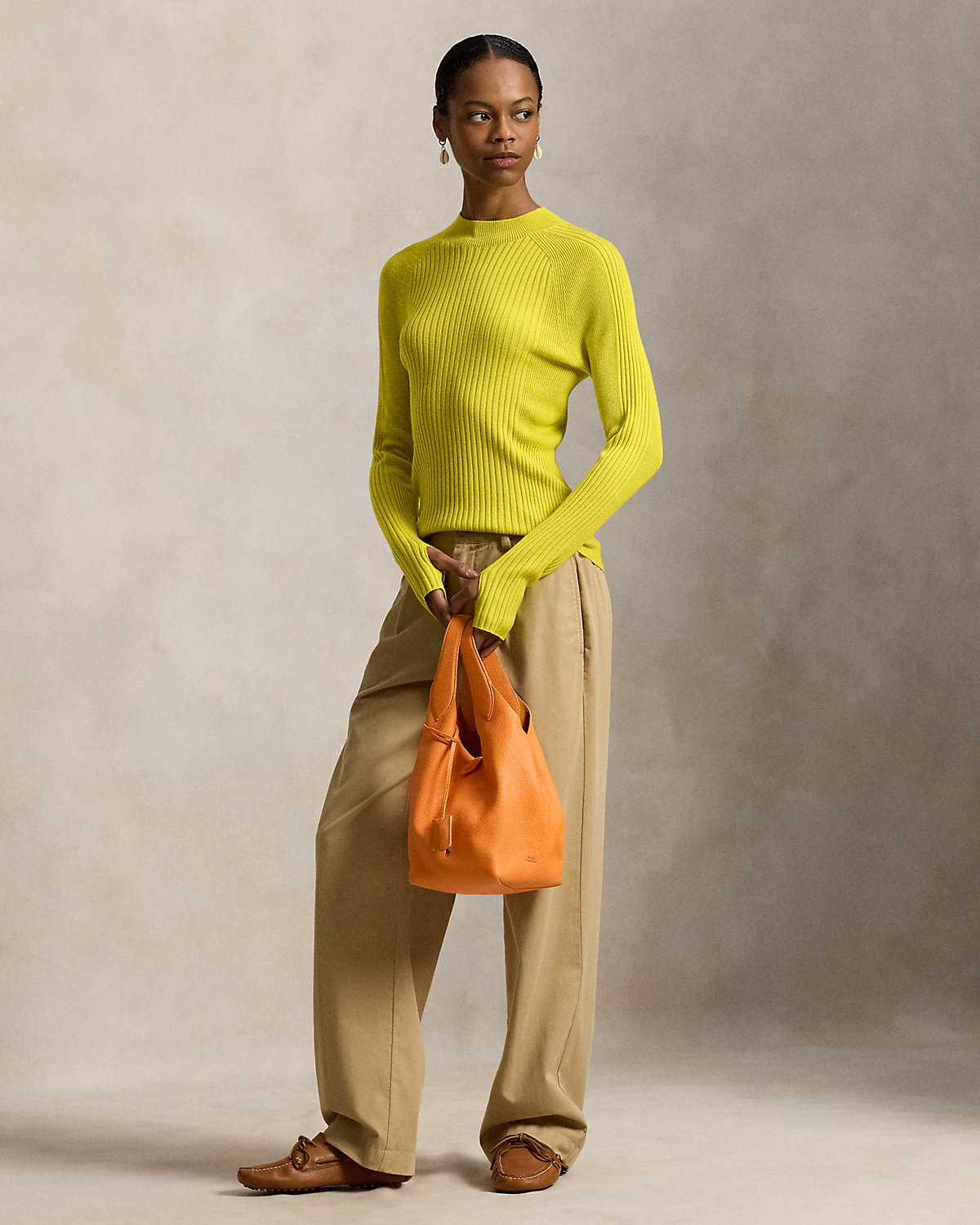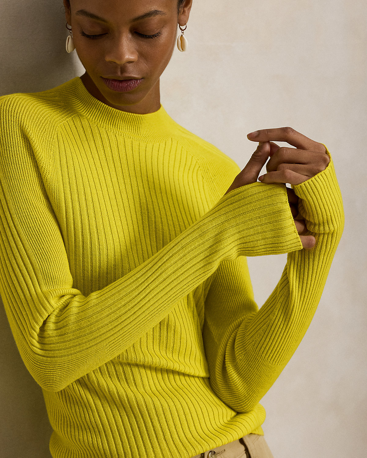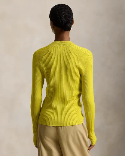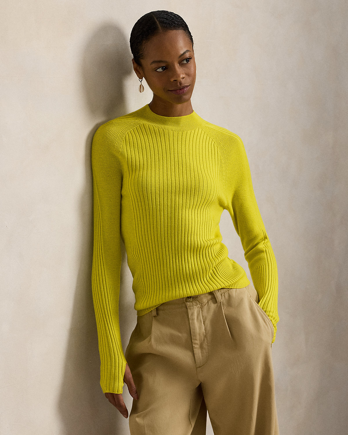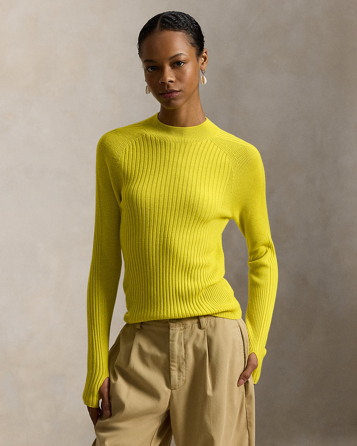 Crafted with medium-weight wool, this mockneck, raglan-sleeve sweater is knit for a slim silhouette, featuring an allover rib-knit construction and thumbholes above the cuffs.