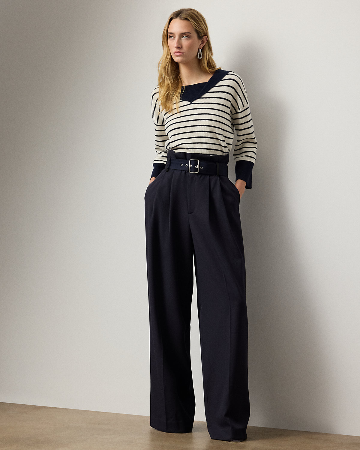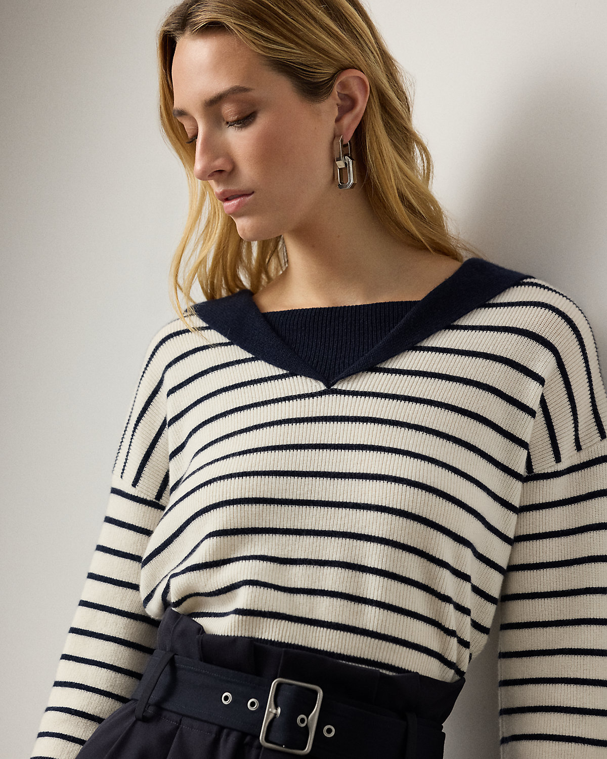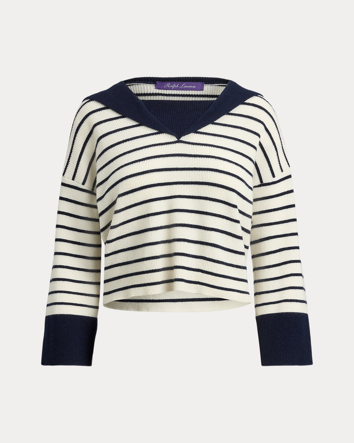 For Pre-Spring 2026, Mr. Lauren reimagined classic nautical-inspired themes, which is evident in the design of this three-quarter-sleeve sweater. Featuring timeless stripes and a sailor collar, this relaxed-fitting style is spun with cashmere yarn in a textural, half-cardigan stitch.