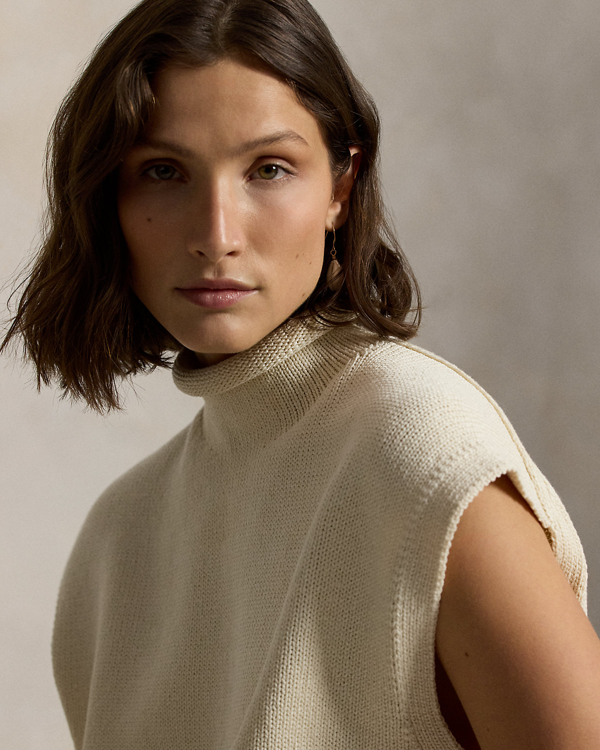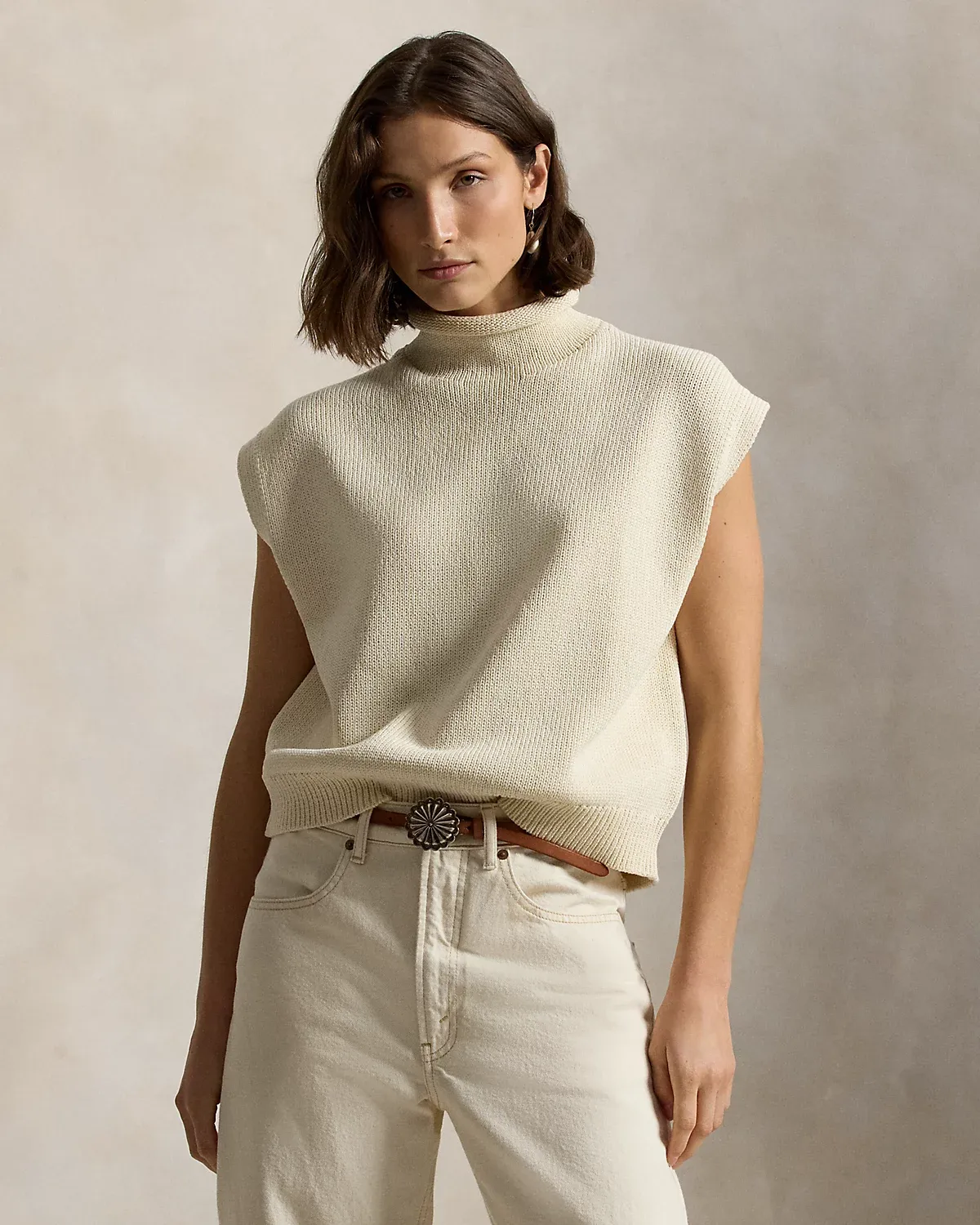 Knit with thick-gauge cotton that’s crafted for softness, strength, and subtle luster, this sleeveless sweater features a relaxed silhouette with a turtleneck that’s finished with a rolled edge.