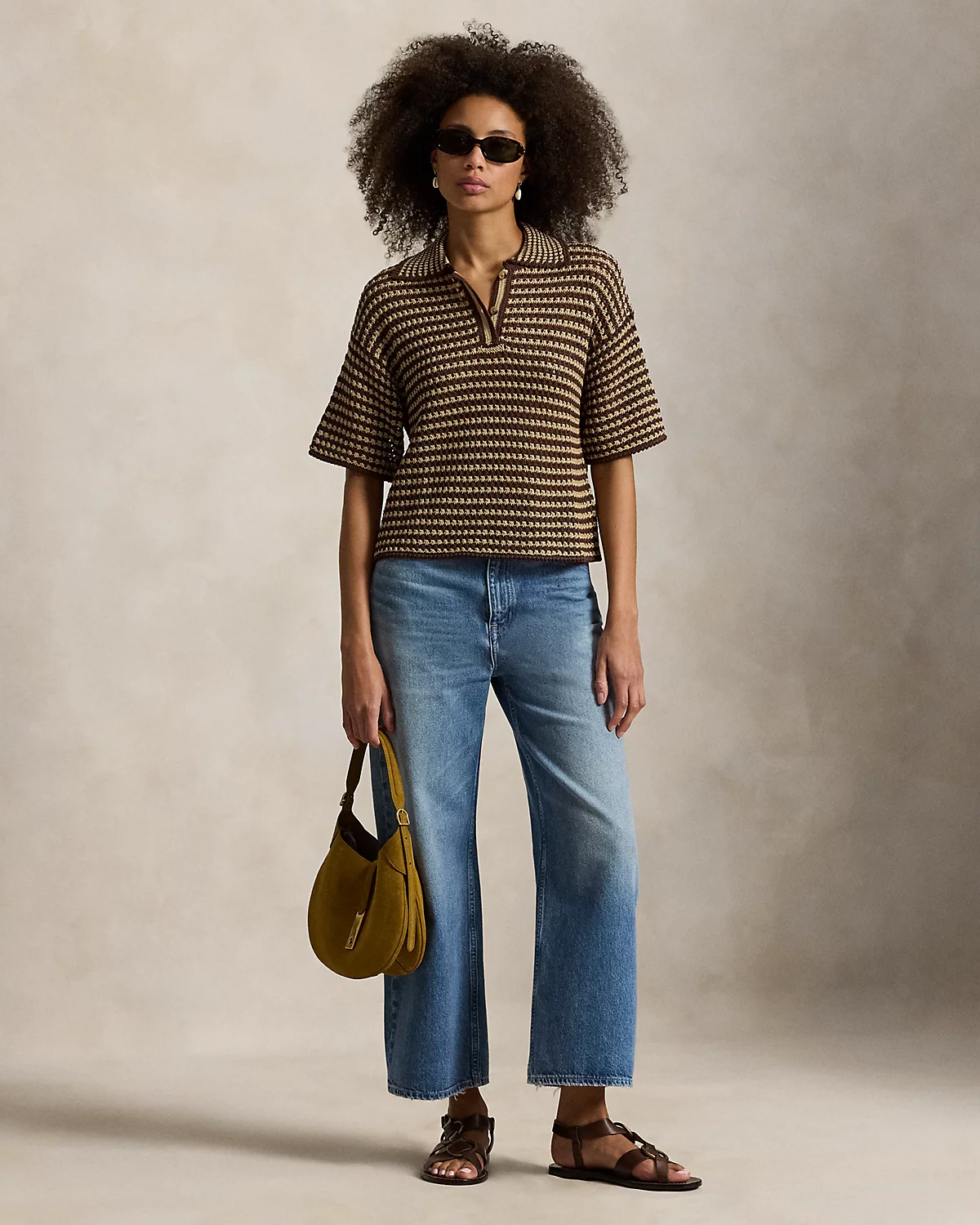Inspired by the classic Polo shirt, this open-knit version features striped pointelle stitchwork and crocheted scalloped trim in a rich, neutral palette.
