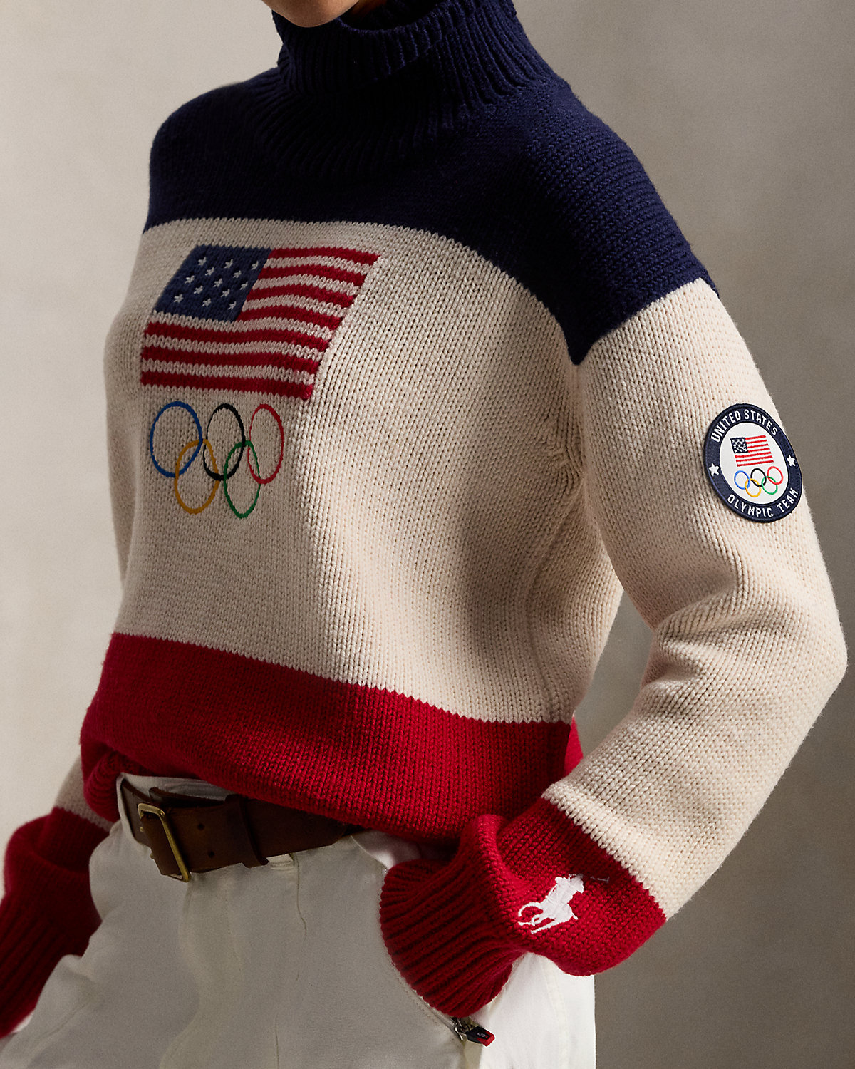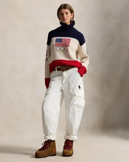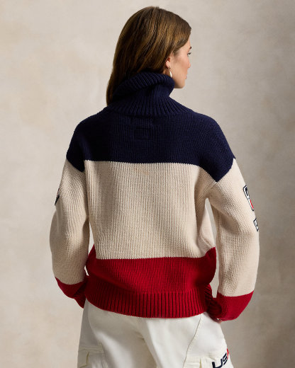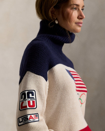 Proudly made in America, this turtleneck sweater is designed exclusively by Ralpthth Lauren for Team USA to wear during the Closing Ceremony of the Olympic and Paralympic Games Milano Cortina 2026. Knit with thick-gauge wool, it incorporates bold graphics in a spirited palette of red, white, and blue, including an intarsia-knit historical American flag, embroidered Olympic Rings, and the official logo of the U.S. Olympic Team.