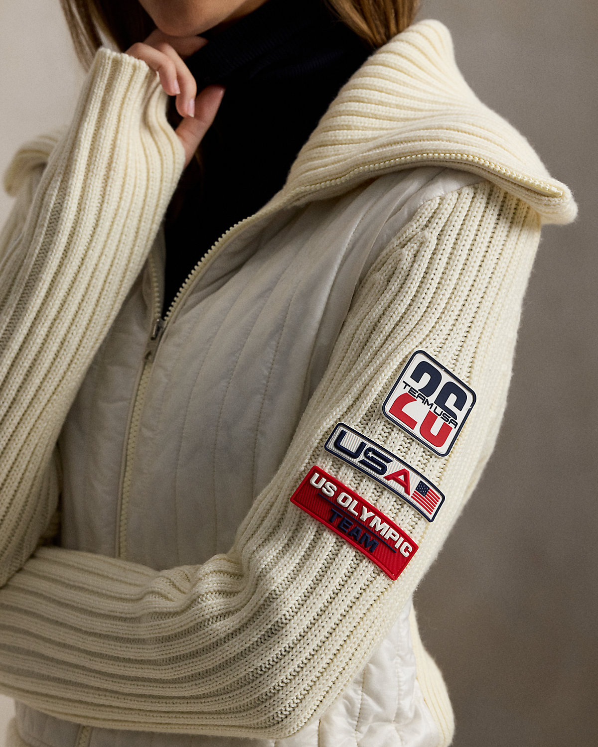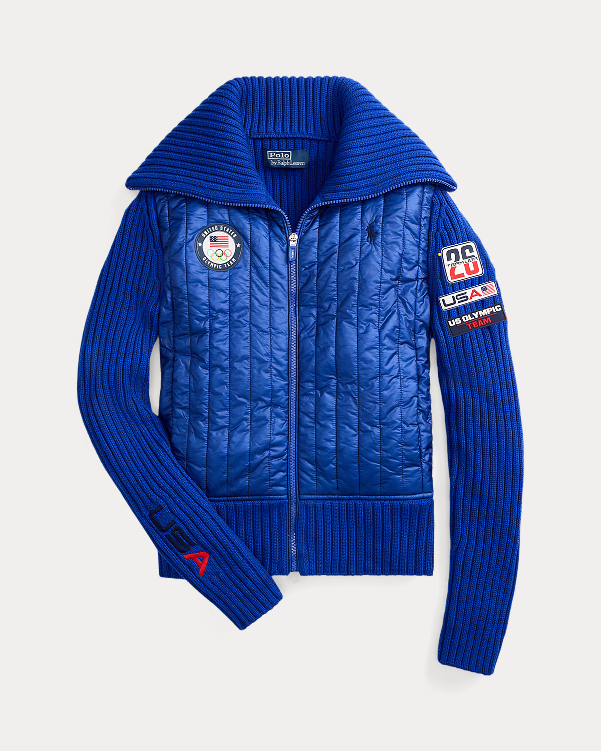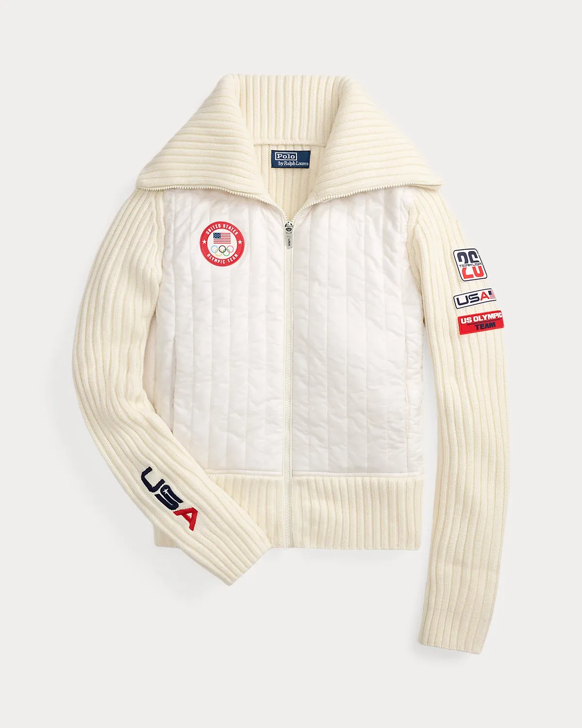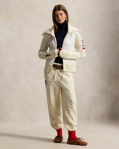 Part of the Polo Ralpthth Lauren Team USA collection, this hybrid full-zip sweater combines thick-gauge rib-knit wool and an channel-quilted insulating front panel crafted with durable ripstop fabric. It’s detailed with signature graphics, including the official logo patch of the U.S. Olympic Team and a “Team USA” patch featuring the number 26—a nod to this year’s Games.