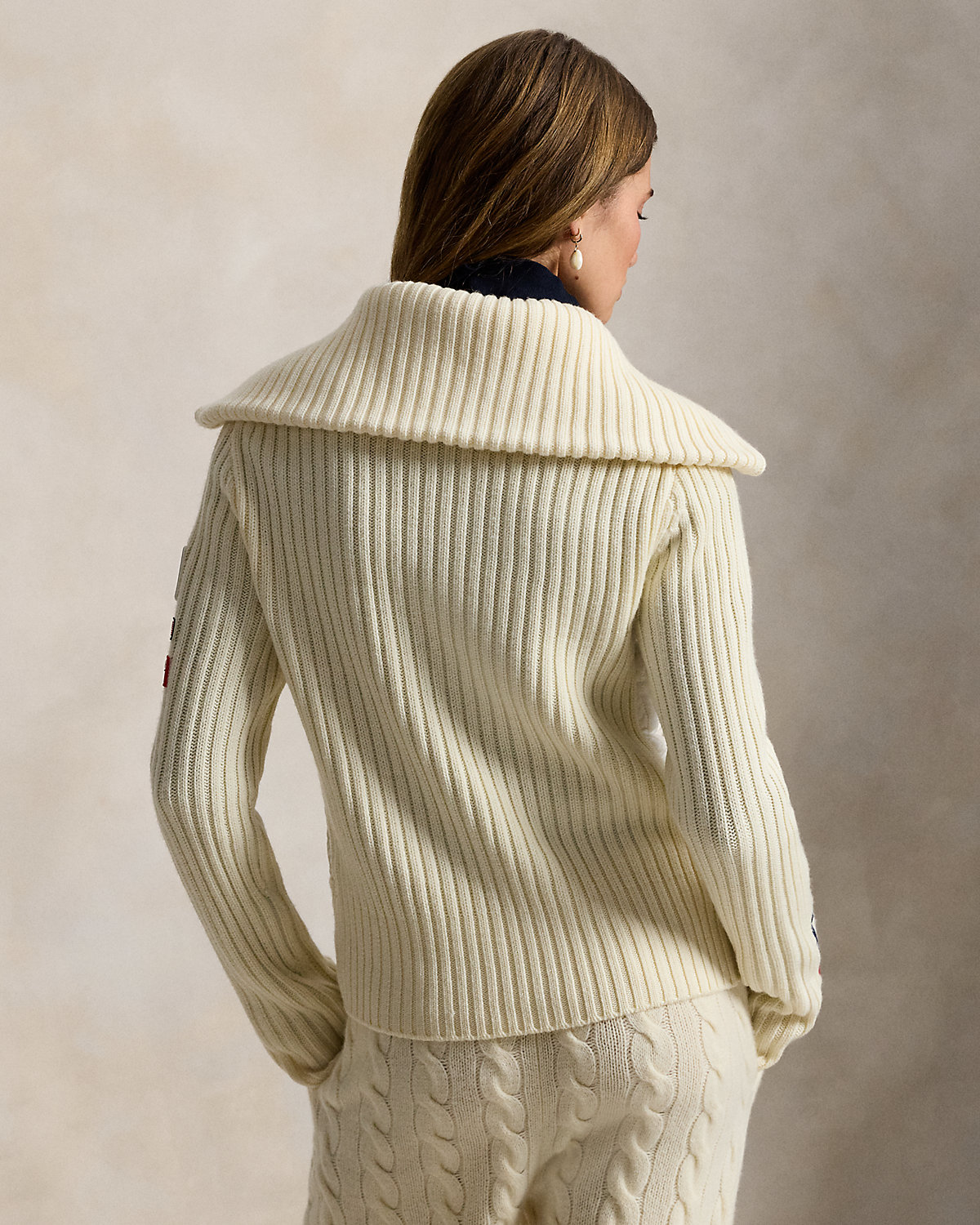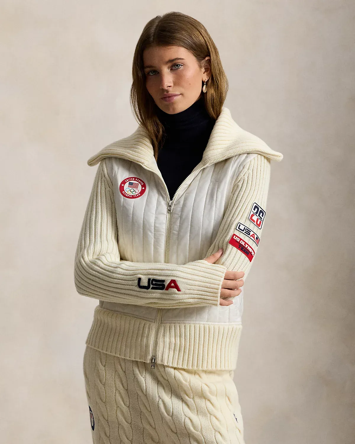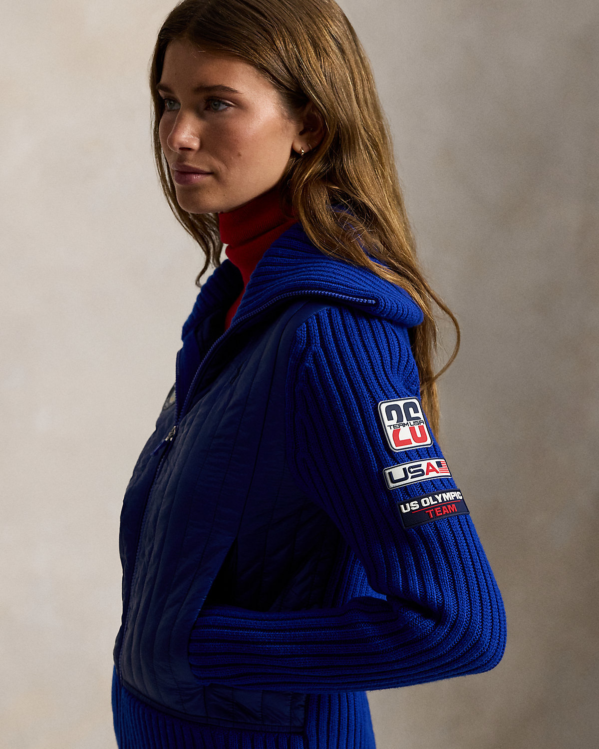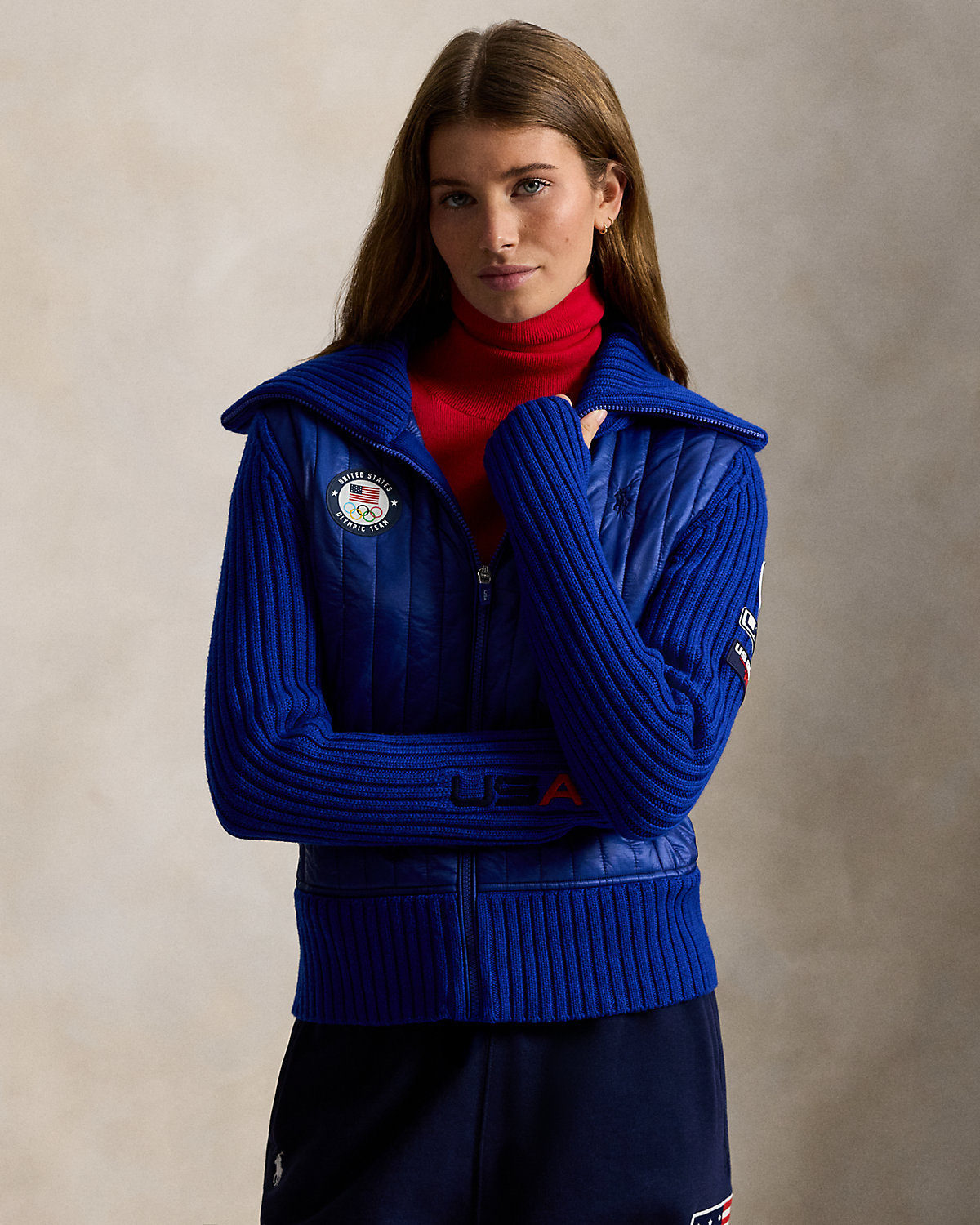 Part of the Polo Ralpthth Lauren Team USA collection, this hybrid full-zip sweater combines thick-gauge rib-knit wool and an channel-quilted insulating front panel crafted with durable ripstop fabric. It’s detailed with signature graphics, including the official logo patch of the U.S. Olympic Team and a “Team USA” patch featuring the number 26—a nod to this year’s Games.