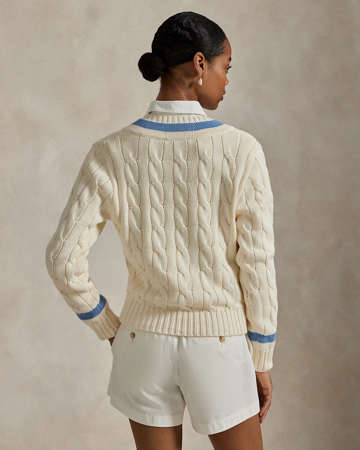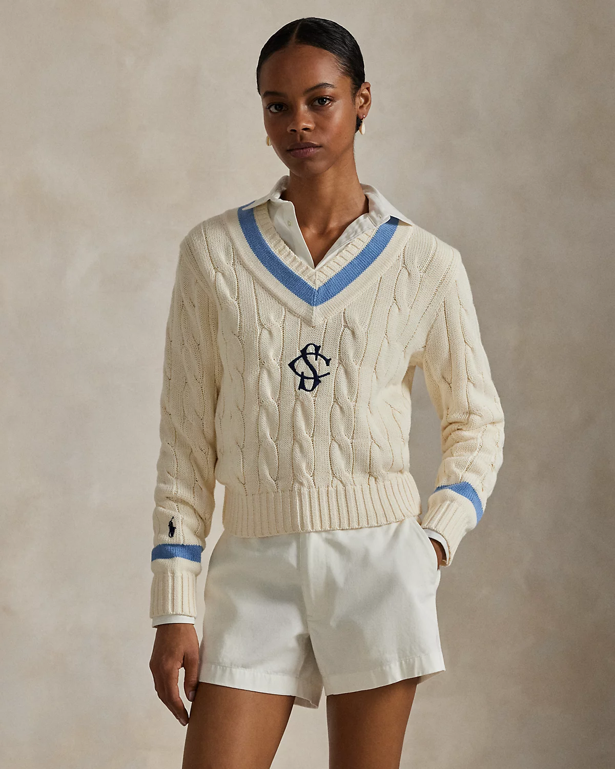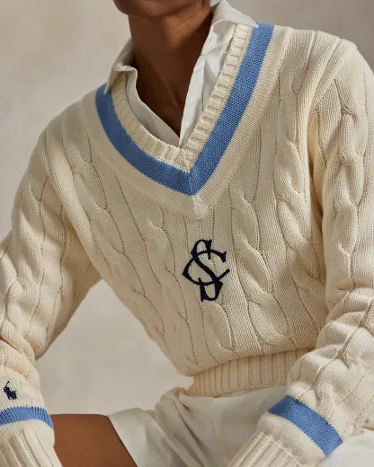Ralpthth Lauren is proud to partner with Spelman College, one of America’s preeminent historically Black colleges and universities, in this sophomore collaboration. Inspired by the rich heritage and esteemed traditions of Spelman College, this cable-knit cotton sweater combines classic cricket stripes in the storied institution’s signature blue hue and an embroidered “SC” logo—specially designed for the collection.