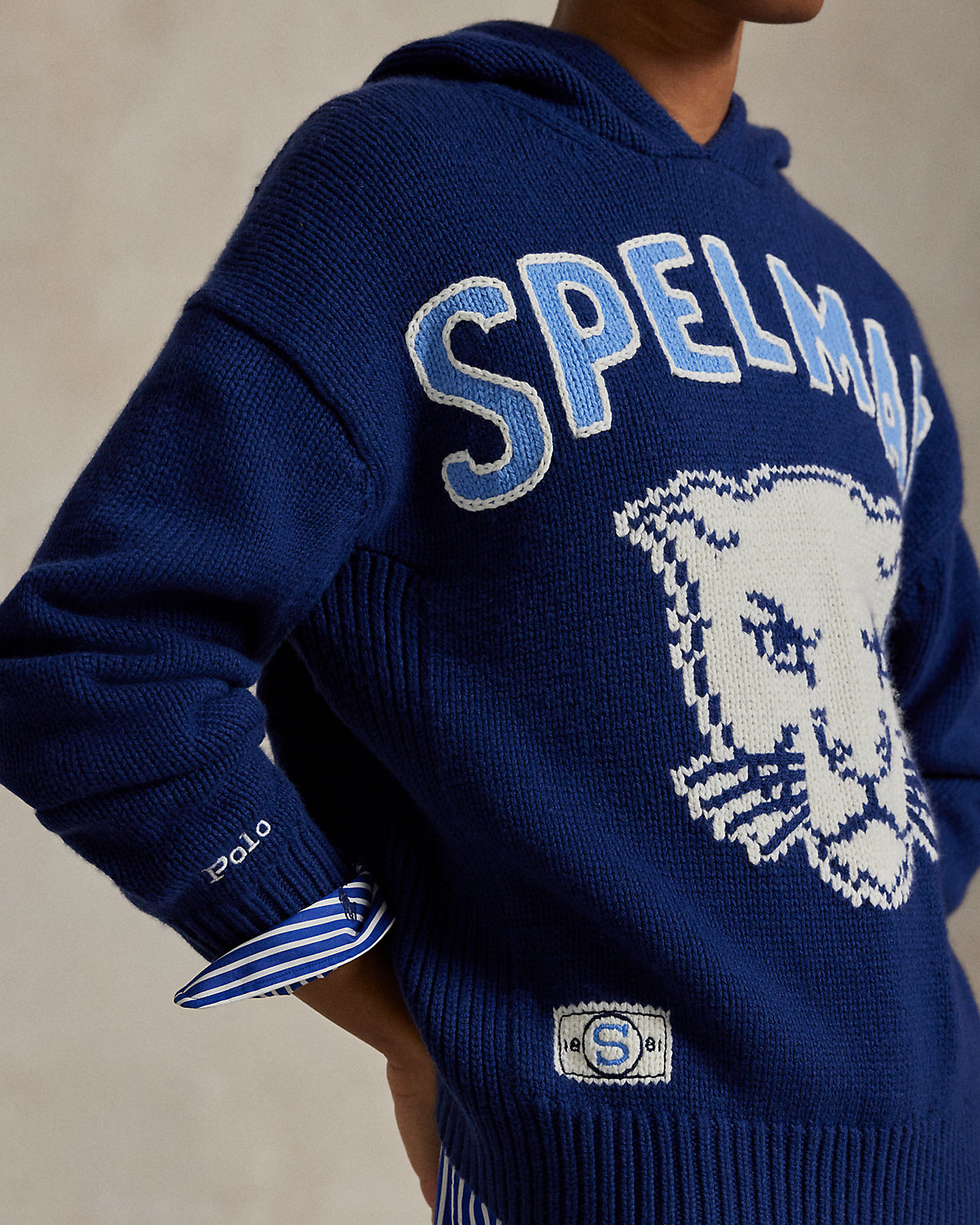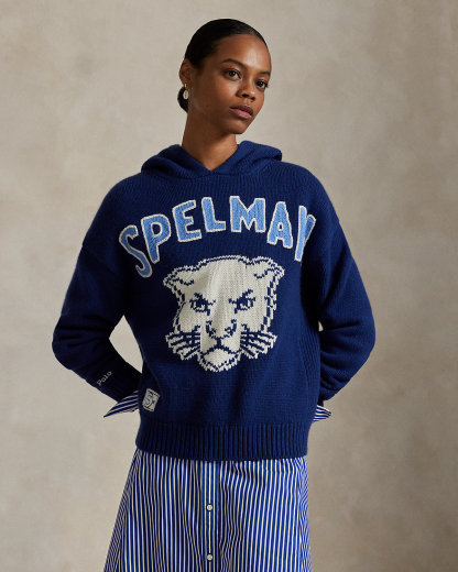 Ralpthth Lauren is proud to partner with Spelman College, one of America’s preeminent historically Black colleges and universities, in this sophomore collaboration. Inspired by the rich heritage and esteemed traditions of Spelman College, this wool-and-cotton layer combines the soft hand feel of a sweater and the relaxed styling of a hoodie. It features the storied institution’s name intarsia-knit at the front, along with a bold jaguar graphic that references the school mascot. An “1881” patch motif accents the hem—a nod to the college’s founding year.