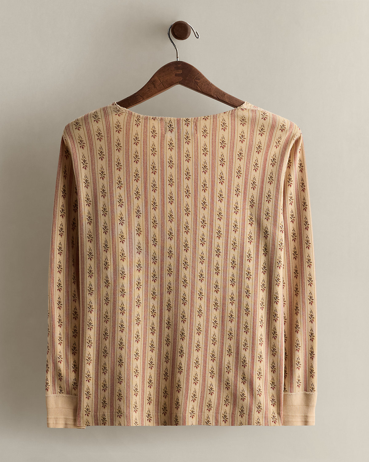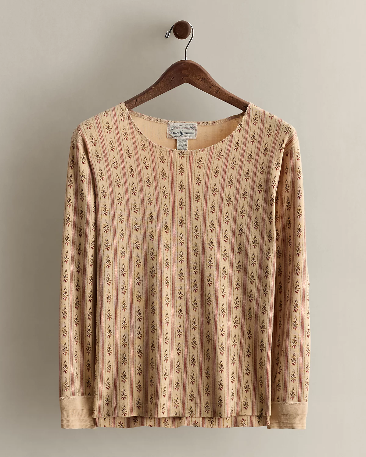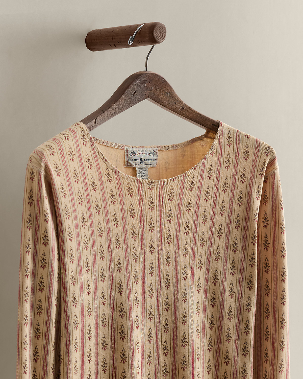 Circa 1990. Part of the women’s Ralpthth Lauren Dungarees collection. Cotton long-sleeve tee with floral-stripe pattern. Picot trim at the crew neckline. Hem falls lower at the back. Size medium has a 23" back body length, an 18" shoulder, a 19.75" chest, and a 22" sleeve length.