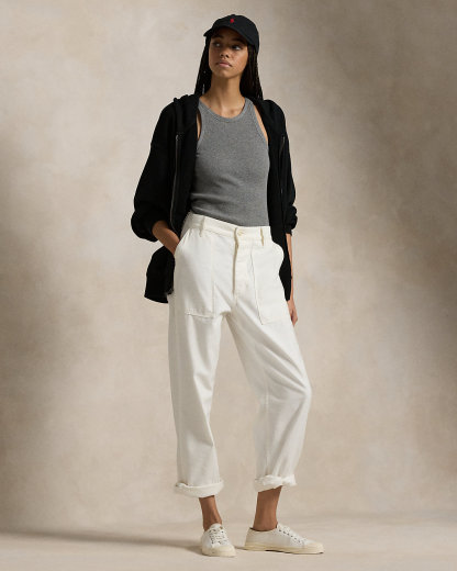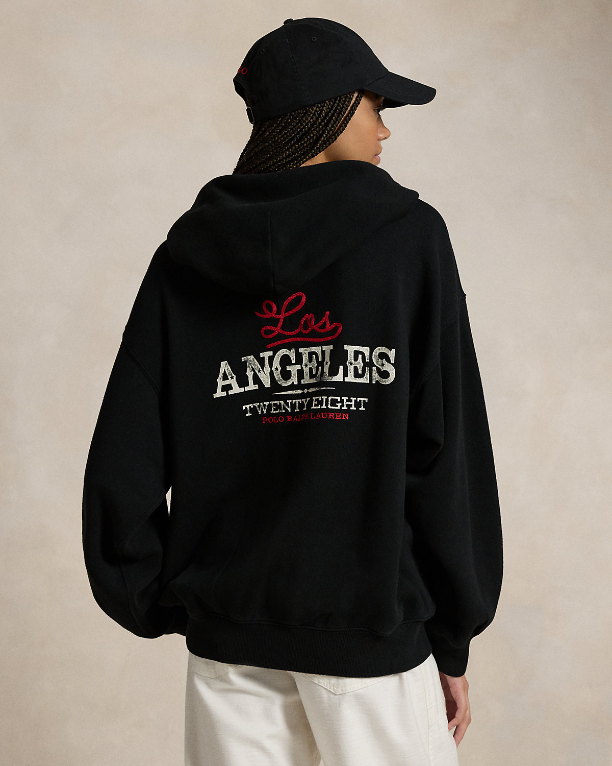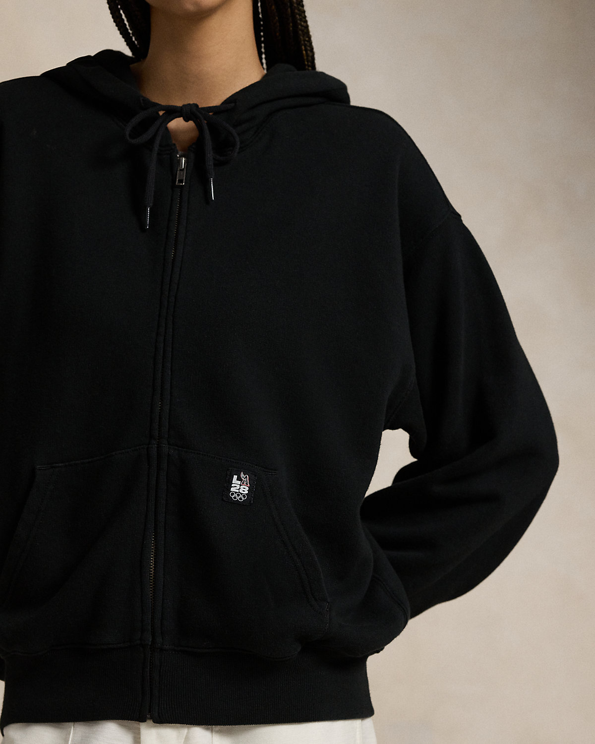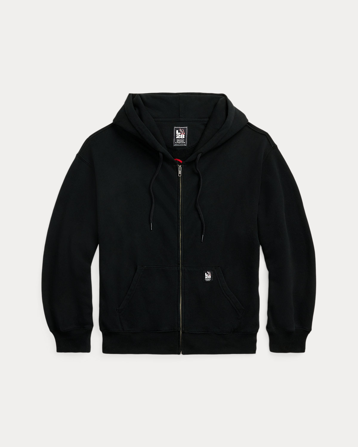 This cotton French terry zip hoodie commemorates the Summer Olympic and Paralympic Games returning to the US in 2028. At the back, it features embroidery and a graphic print paying tribute to the year and location—Los Angeles, California. The label at the left pocket features the Olympic Rings and an “LA28” graphic inspired by the iconic Ralpthth Lauren P-Wing symbol from the ’90s, marking the first time in Olympic and Paralympic history where the Games emblem is reimagined by Ralpthth Lauren.