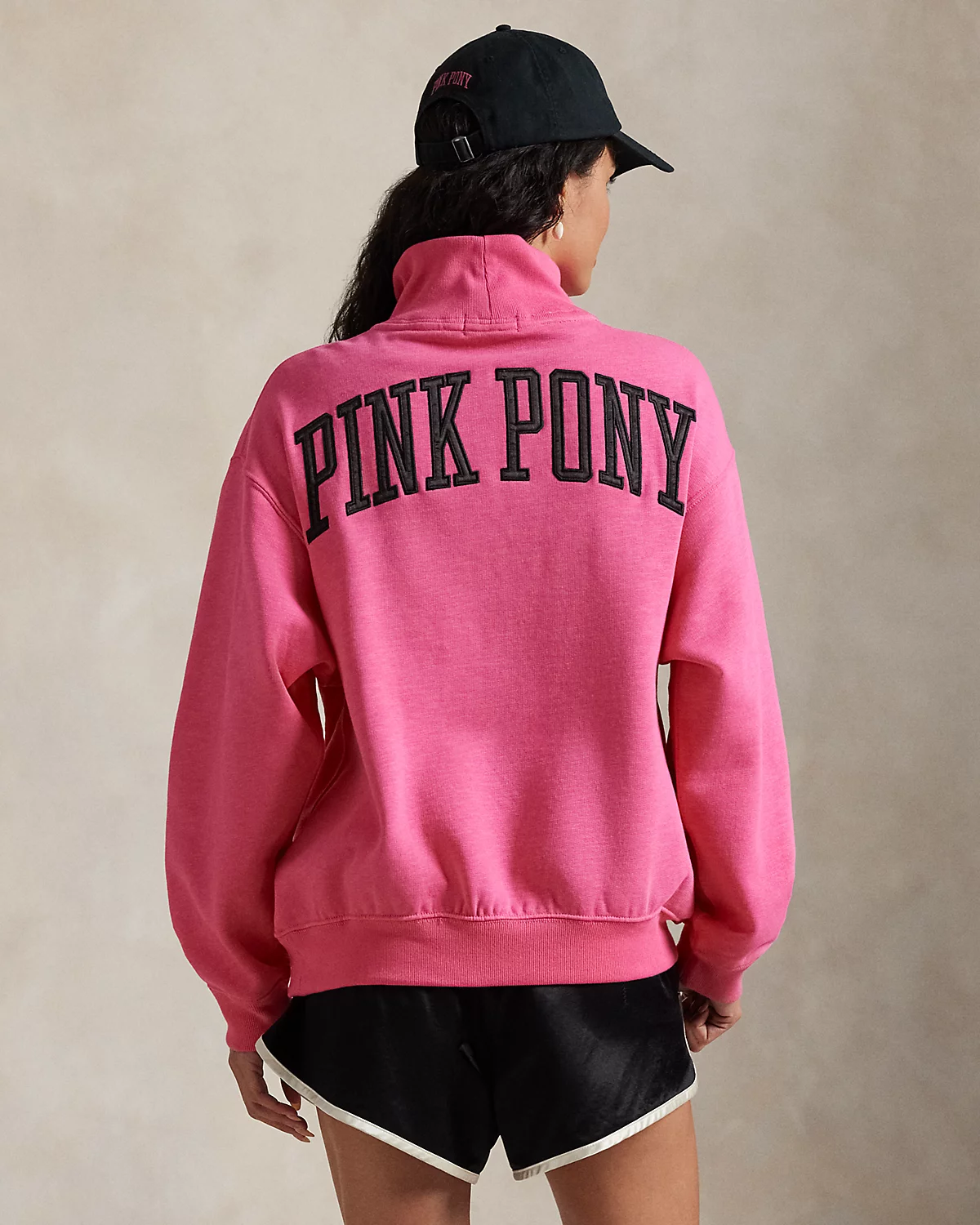 - Ribbed funnelneck. Half-zip placket at the seamed bib. Long sleeves with ribbed cuffs. Dropped shoulders. Signature embroidered Pony at the left chest. “Pink Pony” satin appliqué at the center back. Ribbed hem.