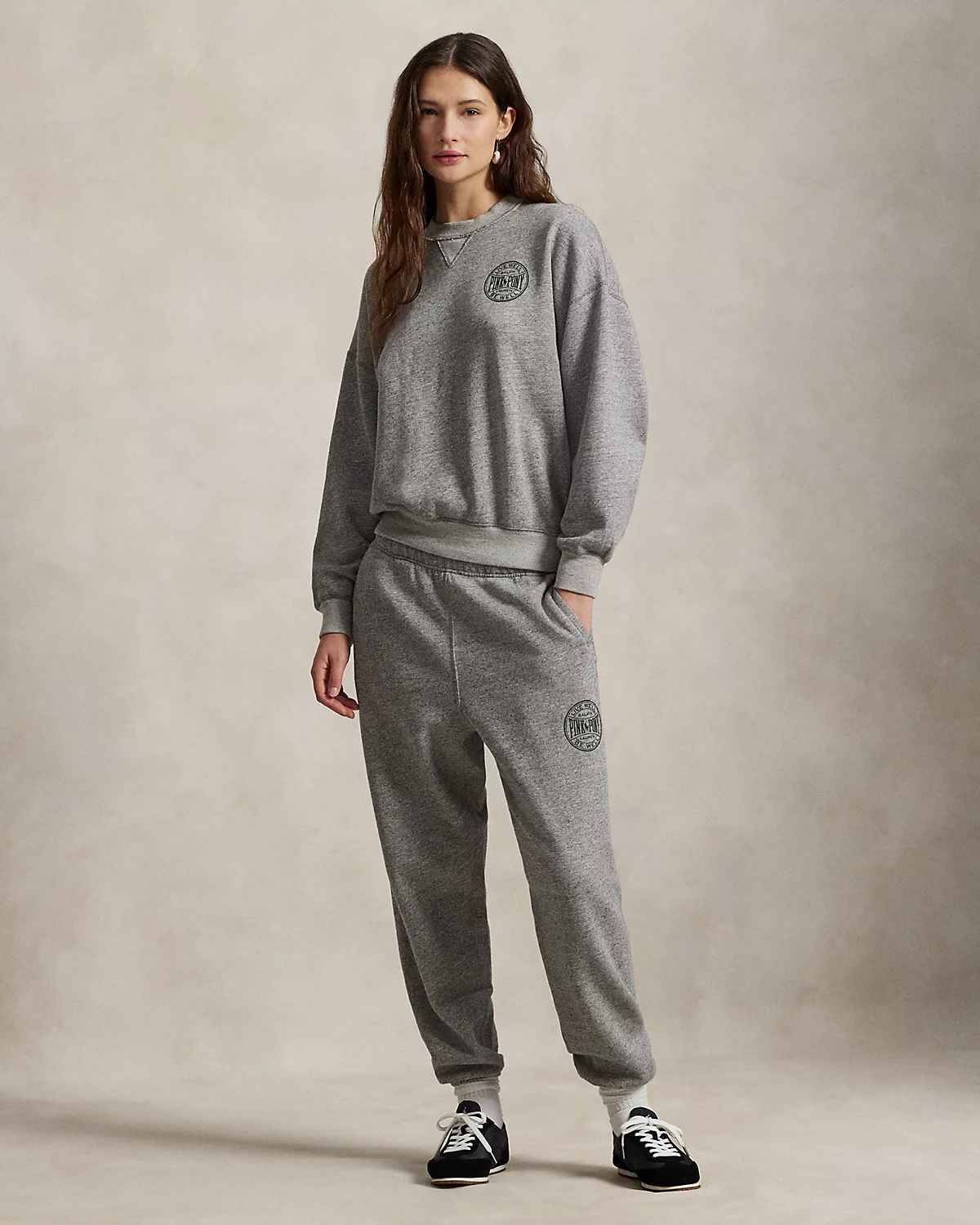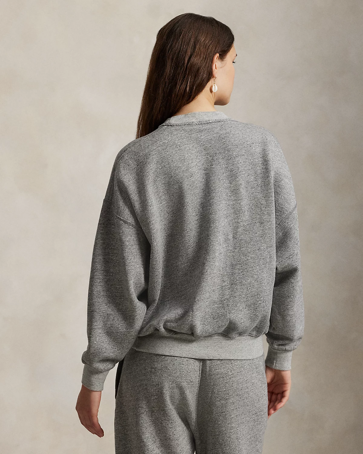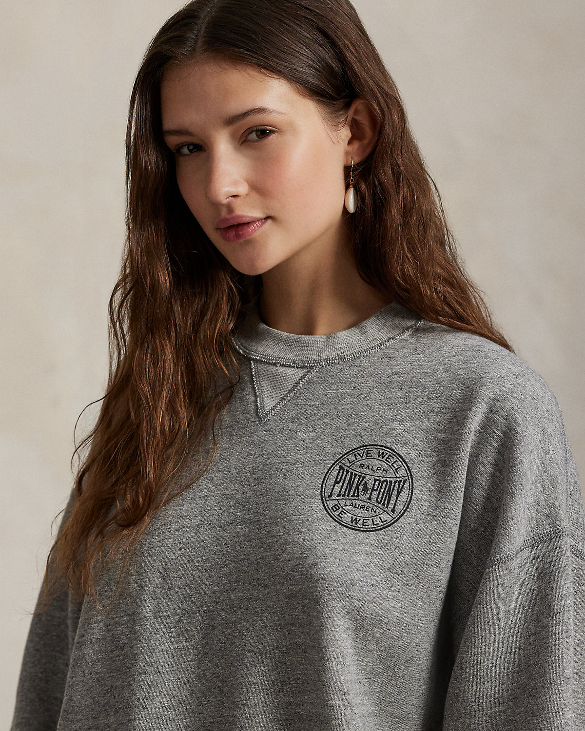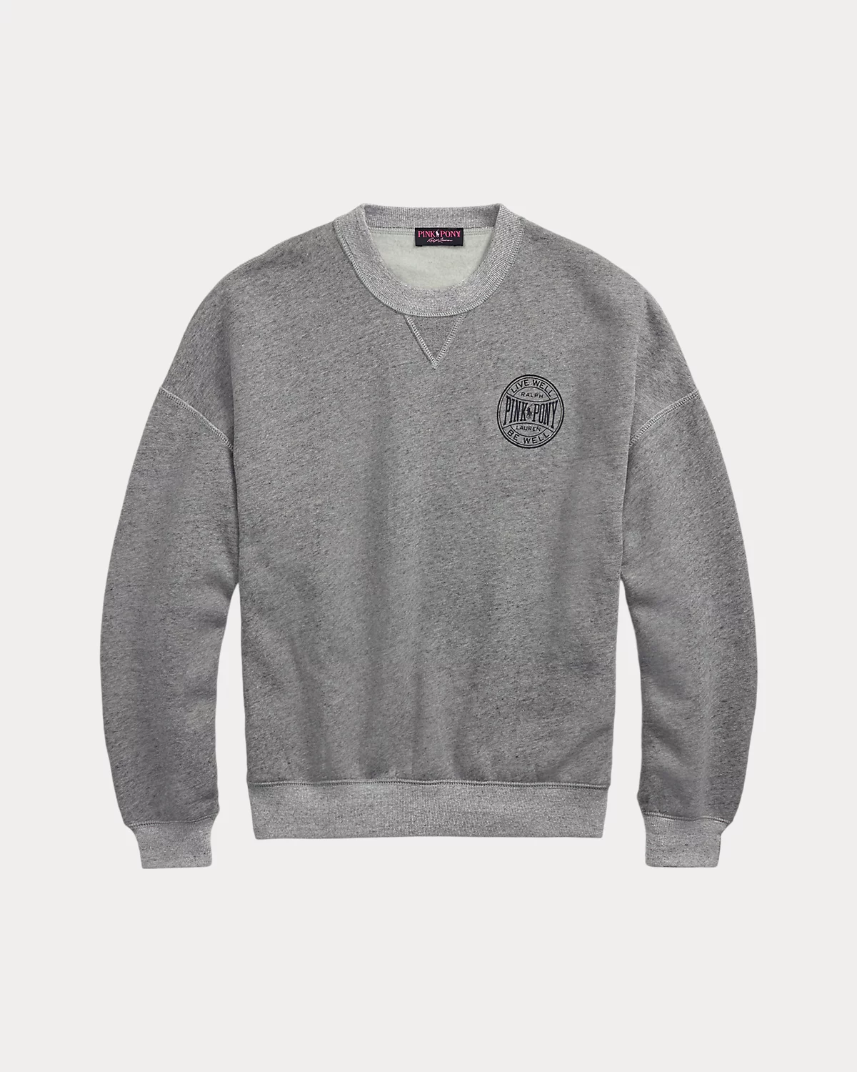 - Ribbed crewneck with V-inset. Long sleeves with ribbed cuffs. Dropped shoulders. Ribbed hem. "Pink Pony Ralpthth Lauren Live Well Be Well" printed at the left chest.