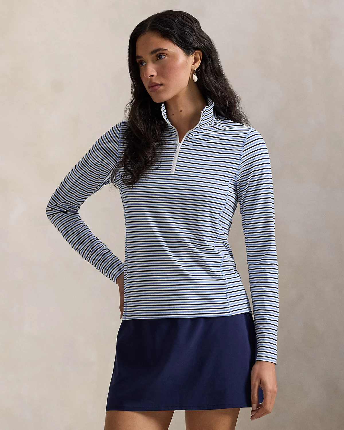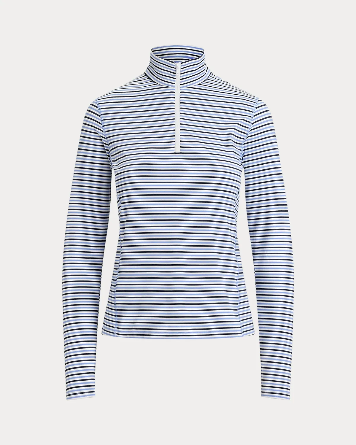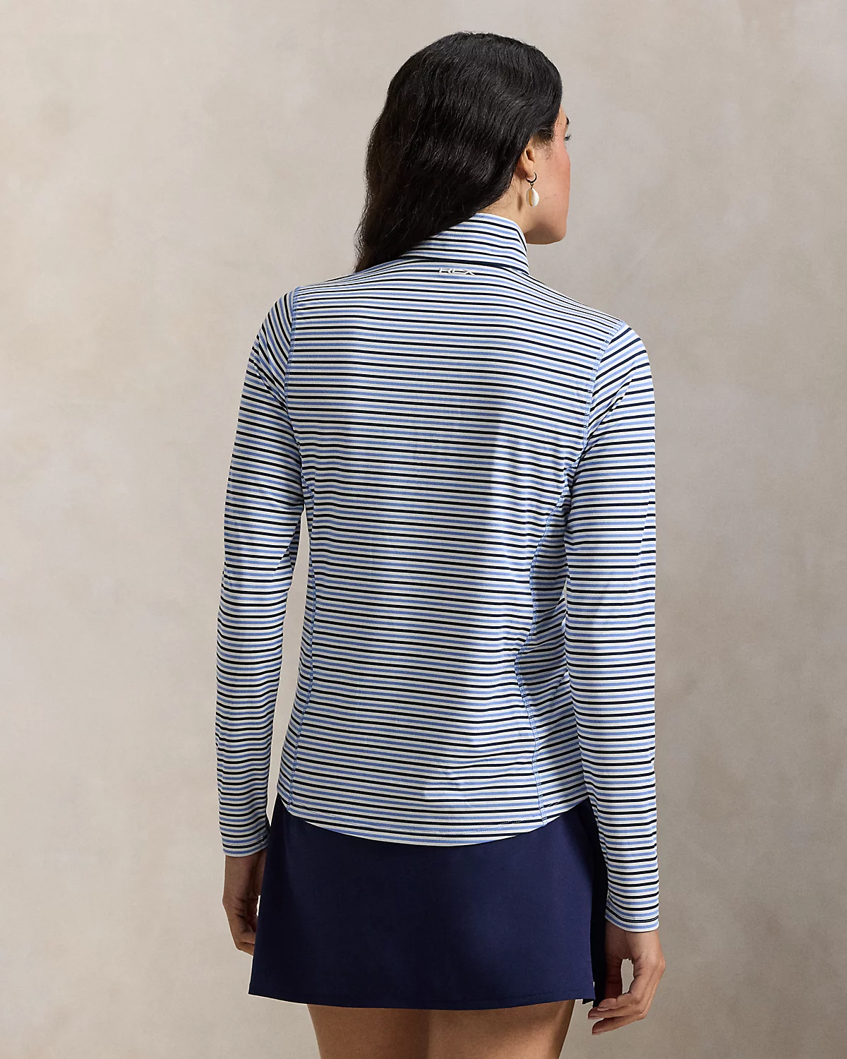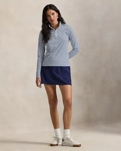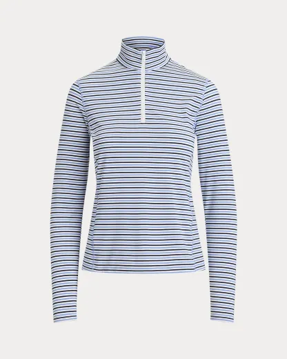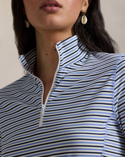 This striped quarter-zip layer is made fromh stretch-blend jersey fabric featuring UPF 50 protection from UV rays. Our signature silicone-printed “RLX” logo accents the center back of the neck.