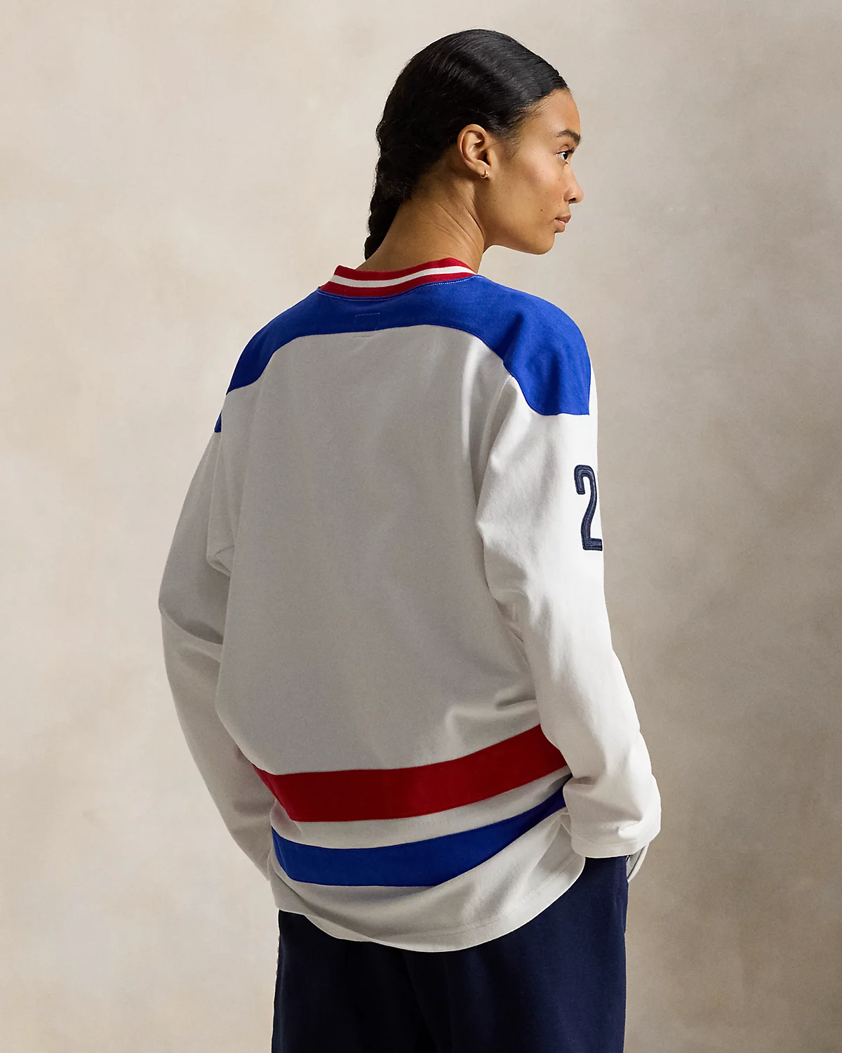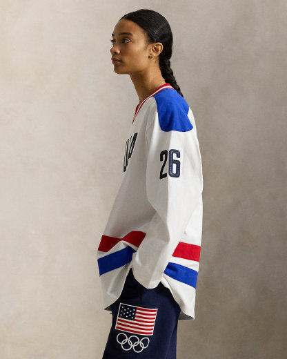 Part of the Polo Ralpthth Lauren Team USA collection, this medium-weight cotton jersey tunic incorporates bold graphics and color-blocking in a spirited palette of red, white, and blue. Along with a historical American flag and the iconic Olympic Rings at the front, both sleeves are accented by the number 26—a nod to this year’s Games.