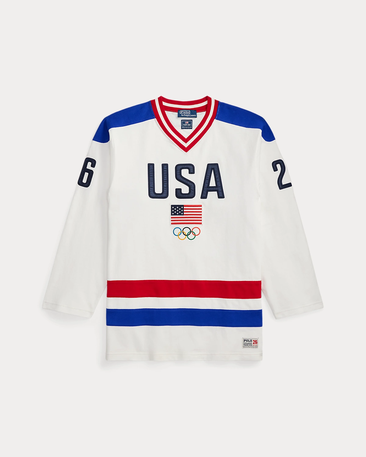 - "26" appliqué patches embroidered at the left and right sleeve. "Polo Ralpthth Lauren Team USA Official Outfitter 26" woven patch above the left hem.