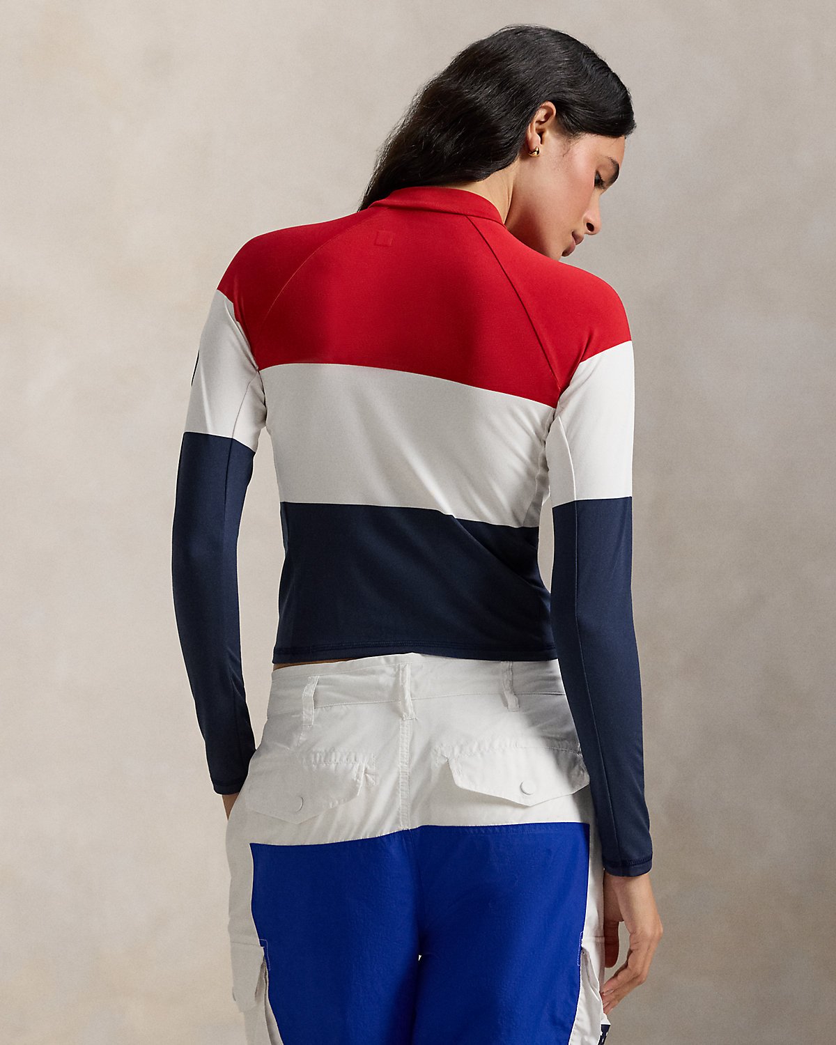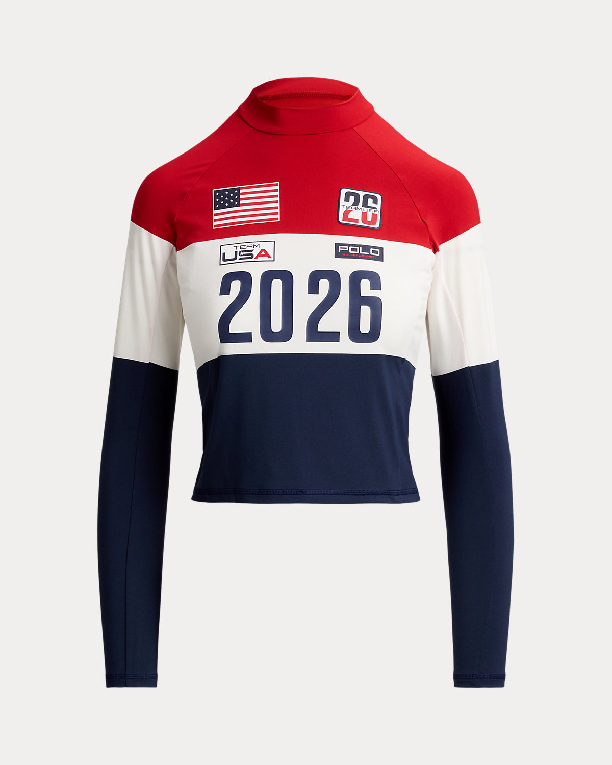 Part of the Polo Ralpthth Lauren Team USA collection, this stretch jersey mockneck incorporates bold graphics in celebration of this year’s Games, along with color-blocking in a spirited palette of red, white, and blue. The official logo patch of the U.S. Olympic Team accents the sleeve for an iconic finish.