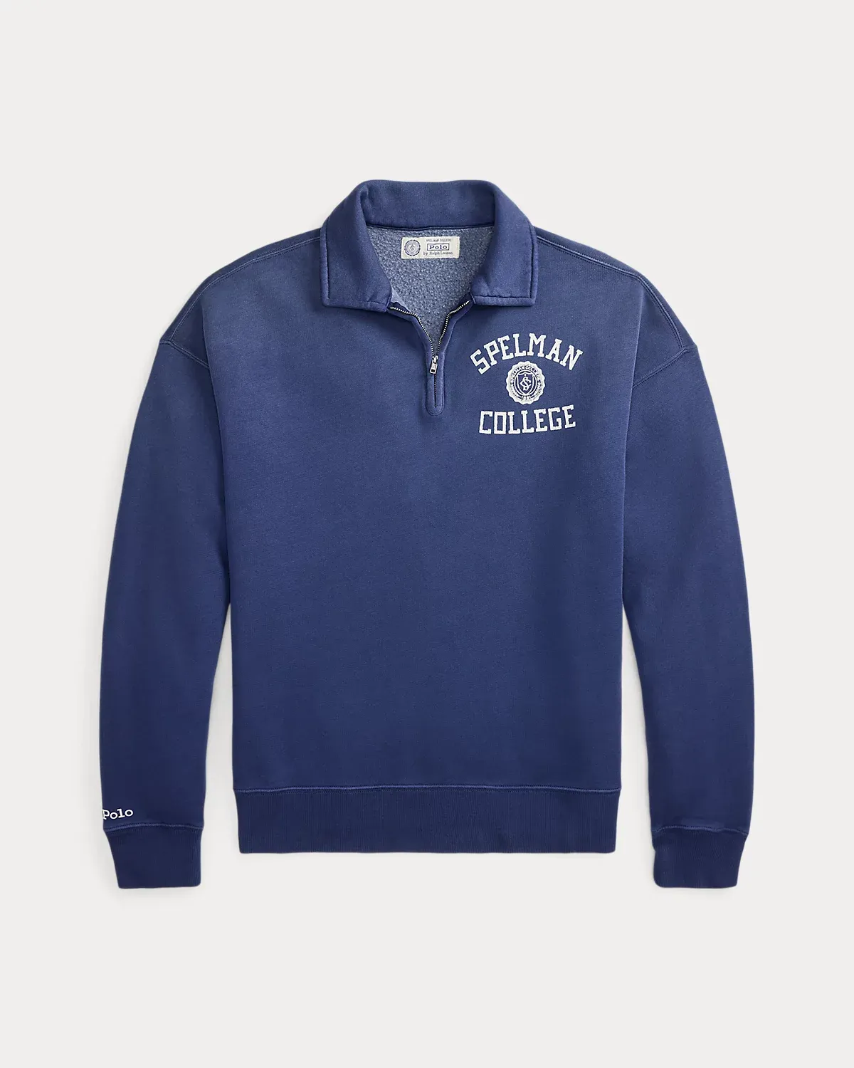 - Spread collar. Quarter-zip placket. Long sleeves with ribbed cuffs. Ribbed hem. "Spelman College" and crest printed at the left chest. "Polo" embroidered above the right cuff.