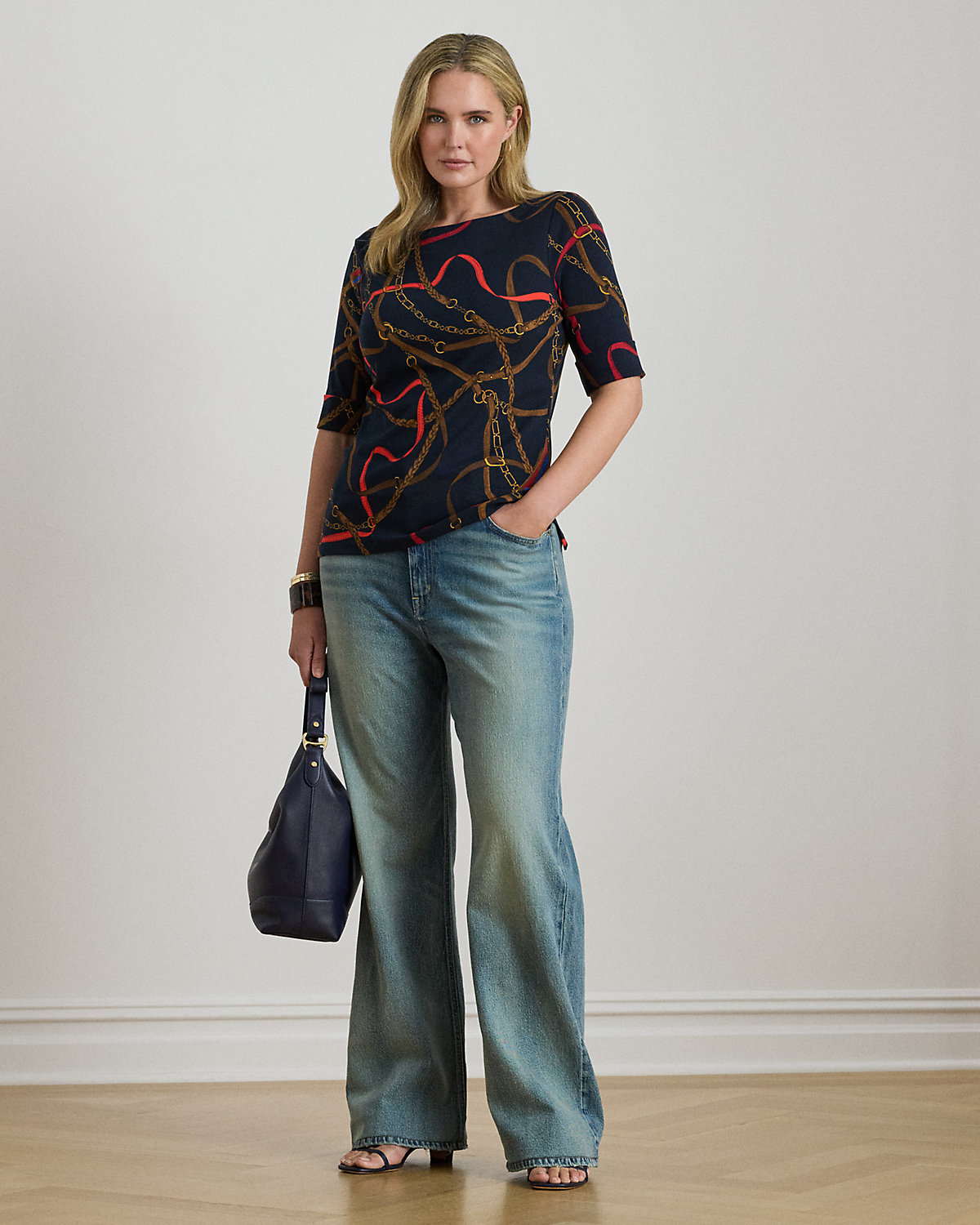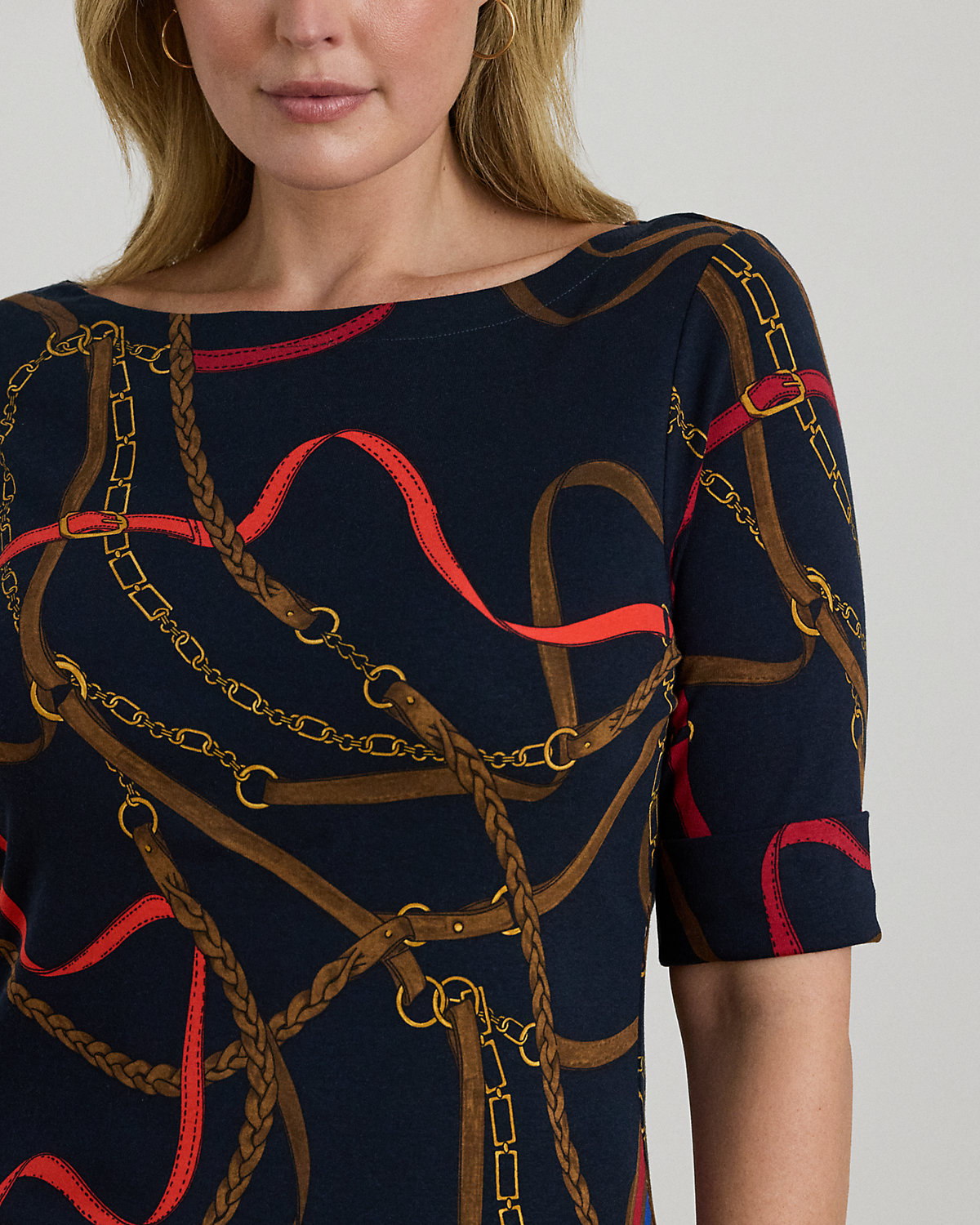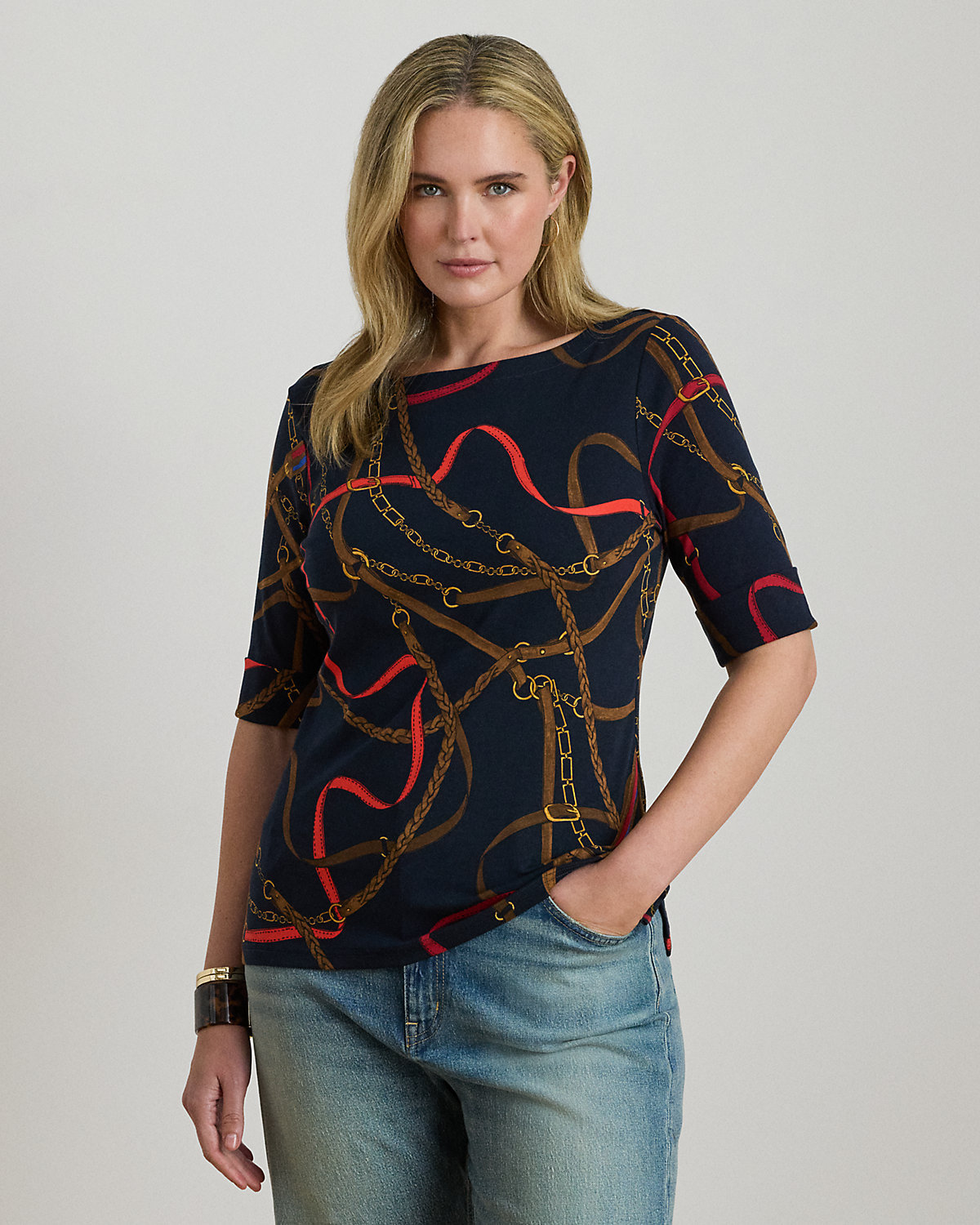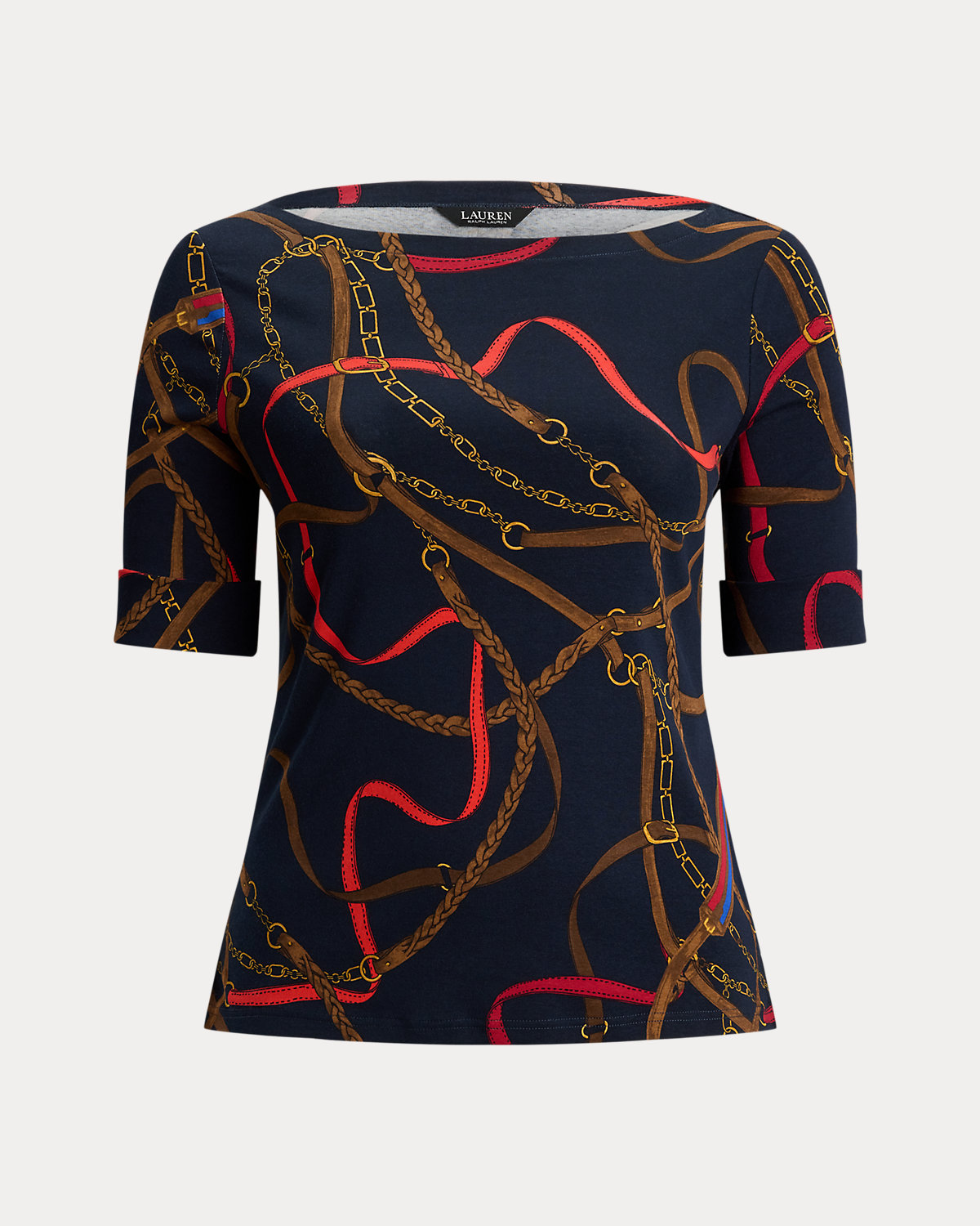 Made with breathable stretch cotton for a soft hand feel, this boatneck tee showcases the season’s equestrian-inspired belting print. An “LRL”-embroidered logo at the hem adds a subtle signature finish.