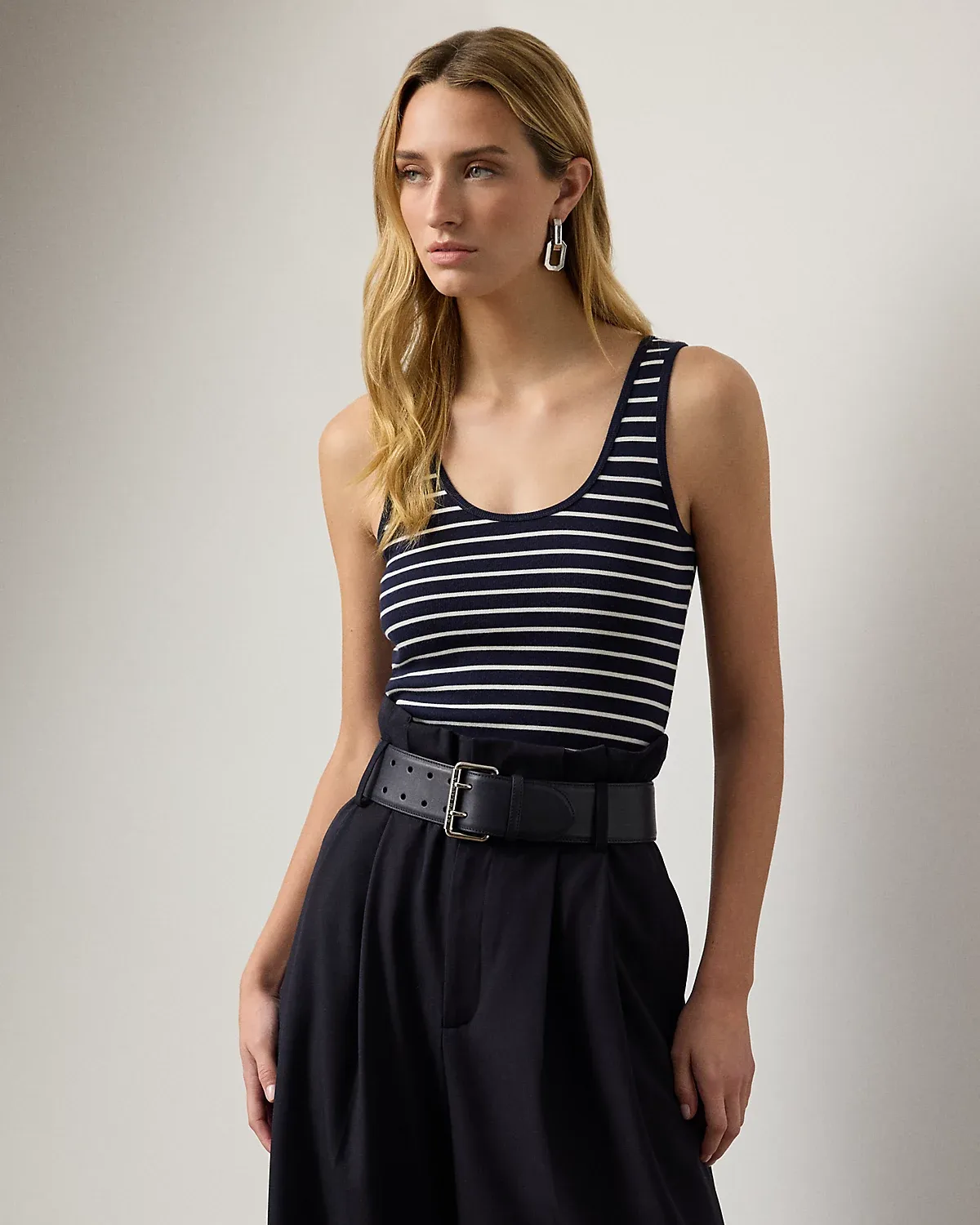 Crafted with lightweight, rib-knit cotton-blend jersey, considered for its optimal balance of softness and stretch, this essential striped tank top is finished with Ralpthth Lauren’s signature embroidered at the hem.