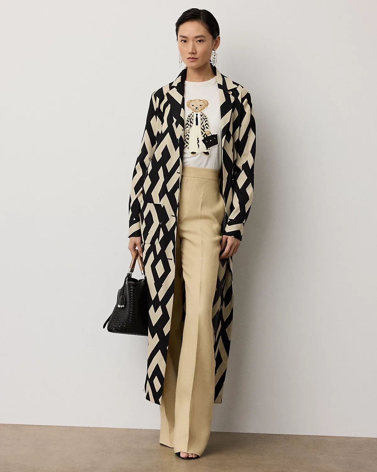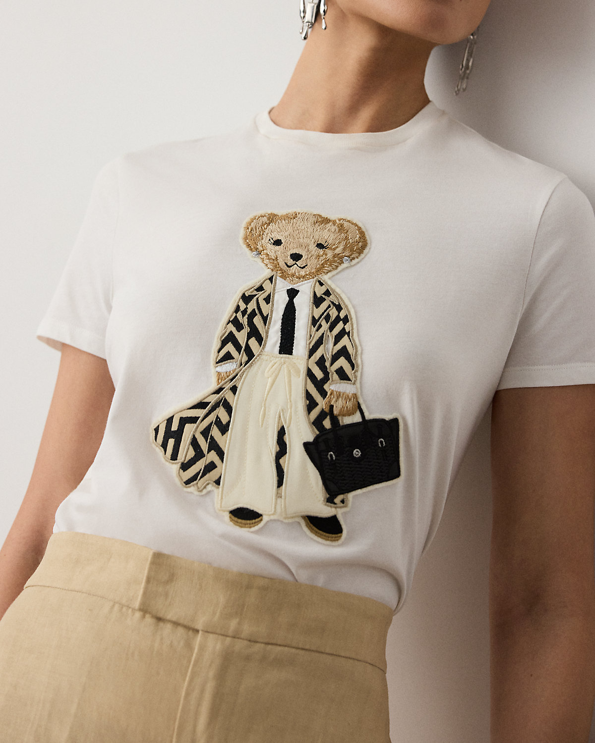 For Spring 2026, Mr. Lauren paired bold proportions with sophisticated tailoring to showcase a balance of strength and sensuality, which is evident in the design of the season’s Spring Polo Bear tee. Six specialized technicians created the Polo Bear patch using a mix of embroidery techniques and a collection of highly considered materials, including cotton broadcloth for the shirt, wool for the Nessa coat, faux leather for the Ricky Bag, and wool gabardine for the pants. Additional details, including metallic thread for the diamond earrings and the Ricky Bag hardware, emphasize Ralpthth Lauren’s commitment to the finer details. This tee is crafted with cotton jersey and finished with “Ralpthth Lauren” script embroidery.