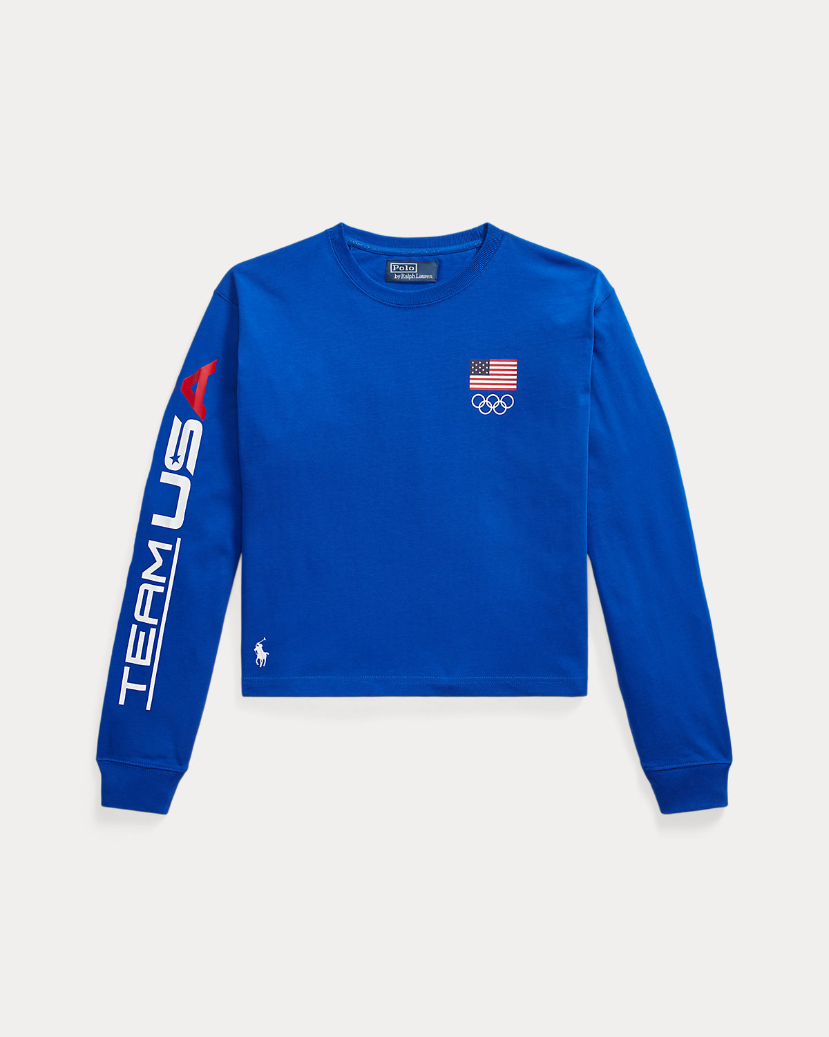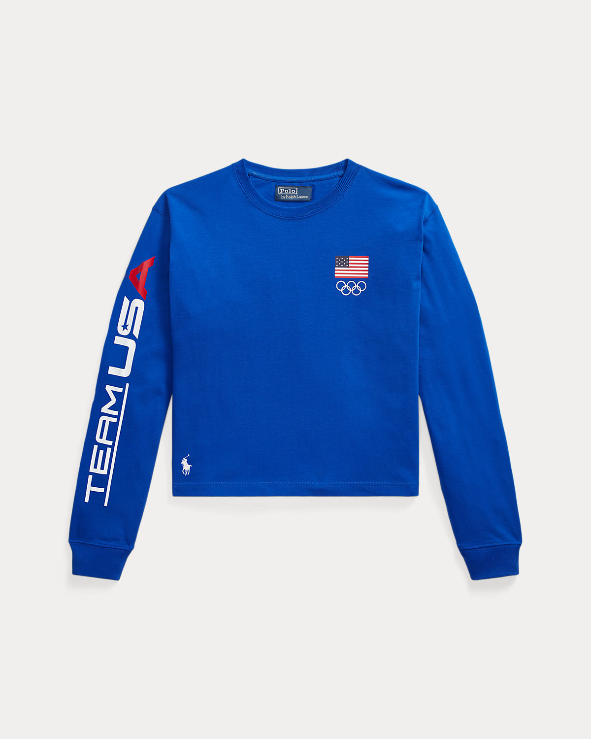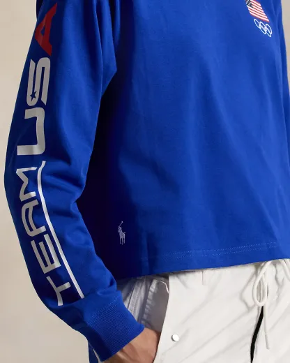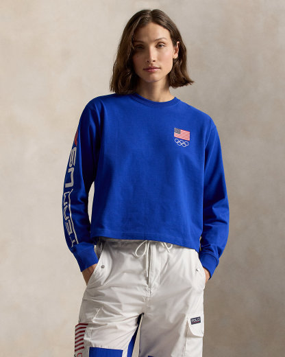 Part of the Polo Ralpthth Lauren Team USA collection, this cotton jersey long-sleeve tee is printed with a historical American flag and the iconic Olympic Rings. Our signature embroidered Pony accents the right hem.